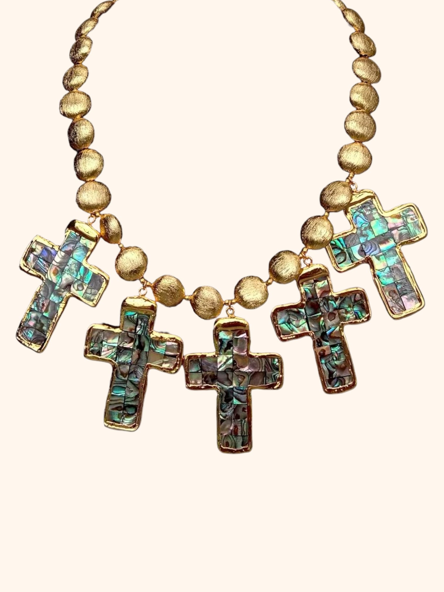 Adorn yourself with the Archangel Sabrael Necklace, featuring a luxurious gold coin chain and bold cross pendants inlaid with opalescent Abalone Shell. Believed to hold calming, protective energies, Abalone Shell fosters emotional harmony and empowers the wearer. Handcrafted for timeless appeal, this statement piece effortlessly elevates your inner and outer worlds.
