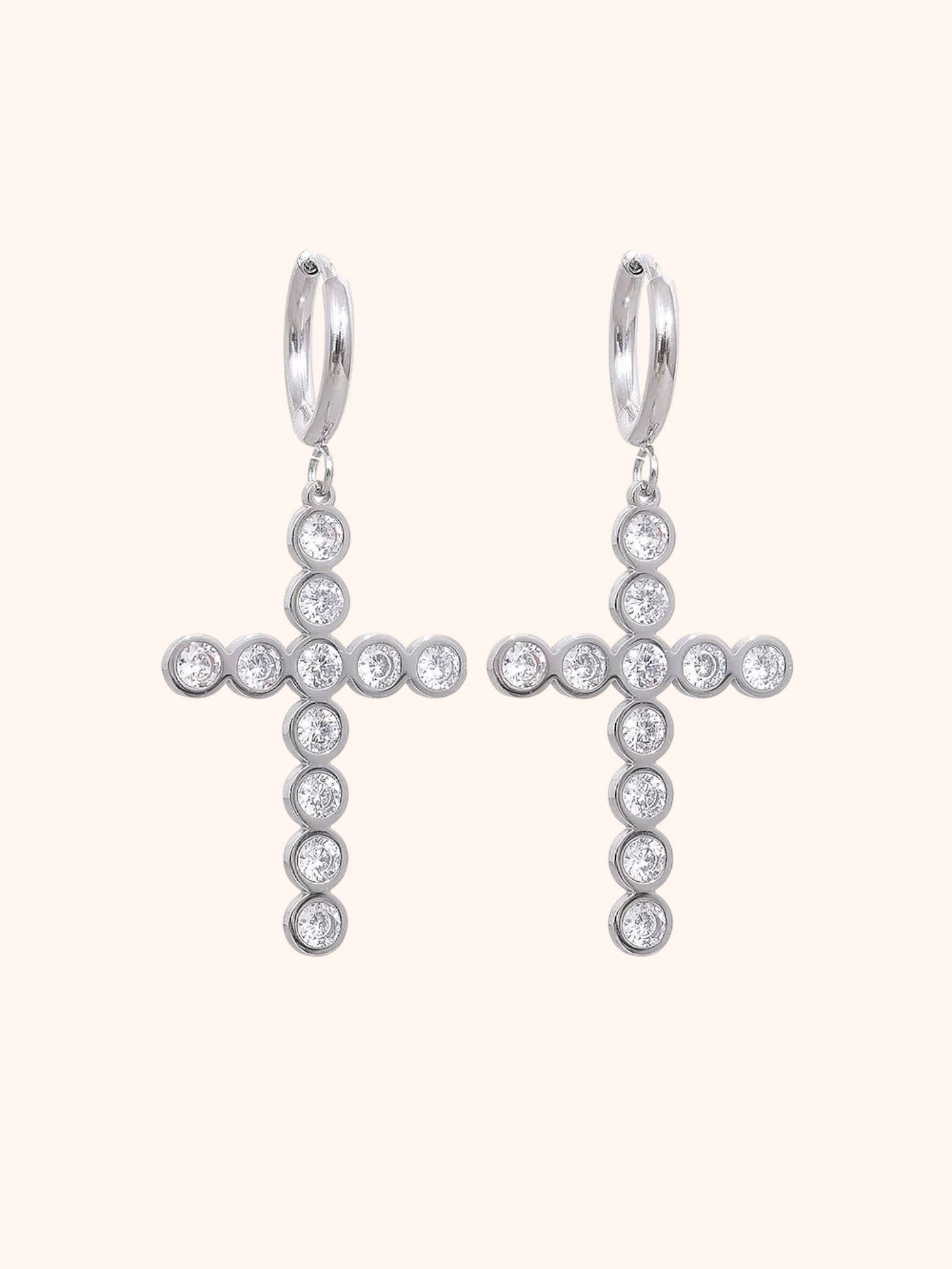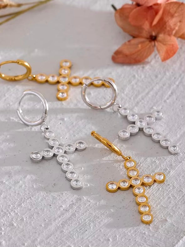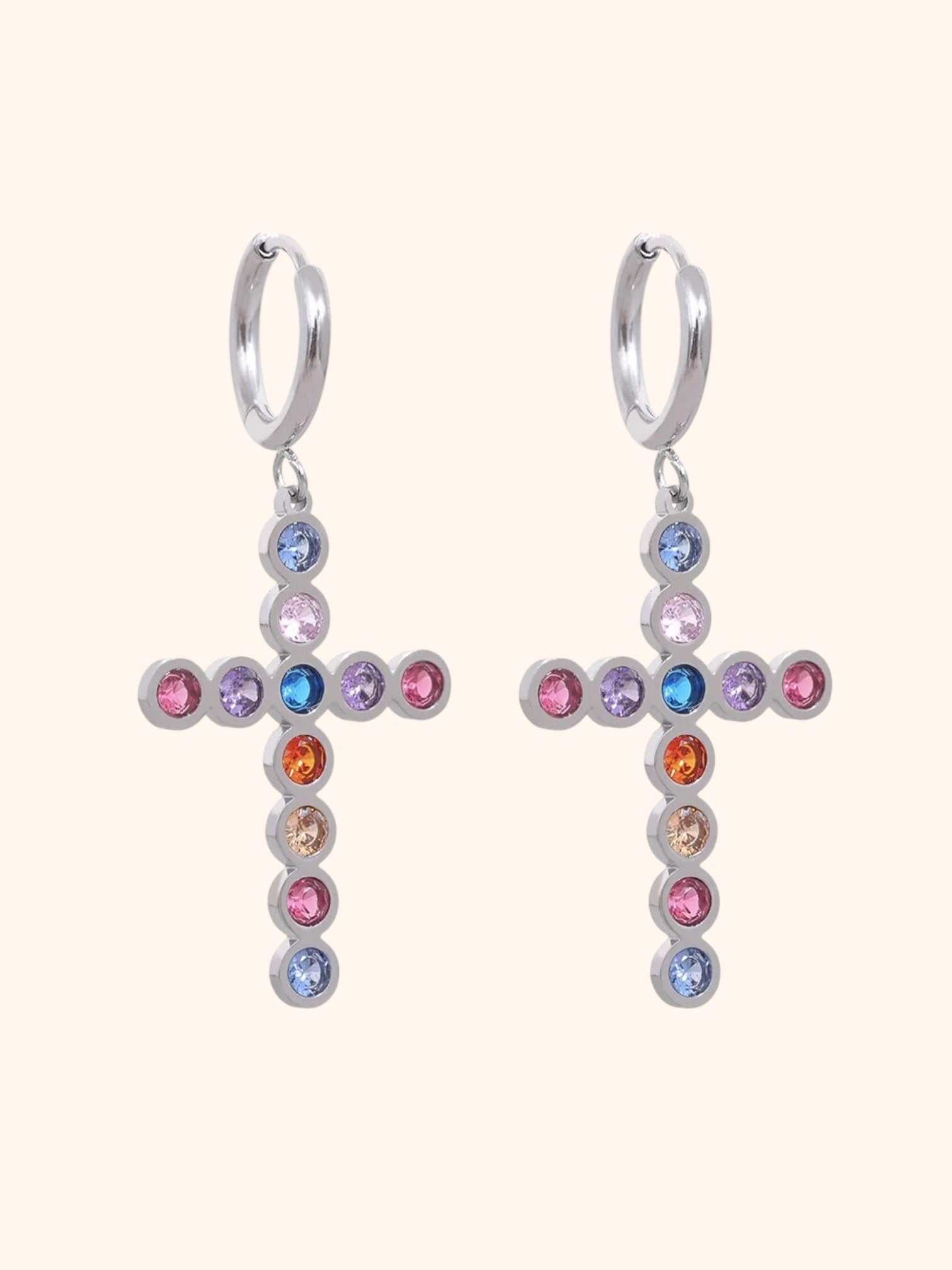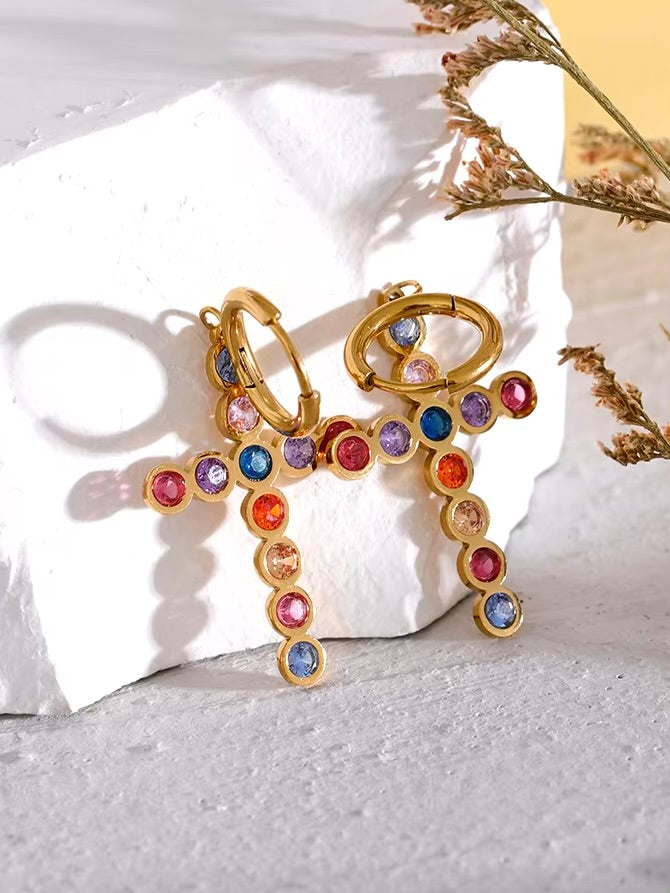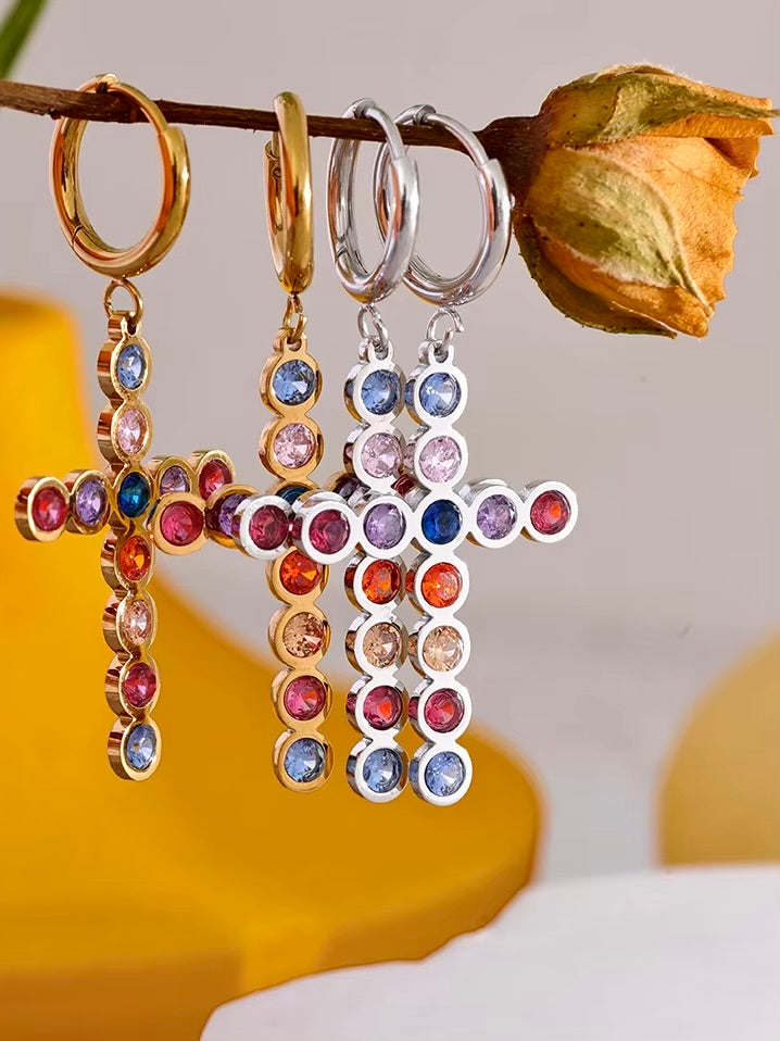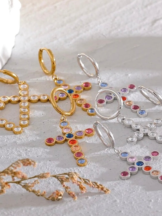 These earrings feature a delicate cross design adorned with luminous cubic zirconia gemstones. Whether in gold or silver, these earrings offer a striking balance of elegance and modernity, adding a touché of brilliance to any look with clear or multicolored gems.
