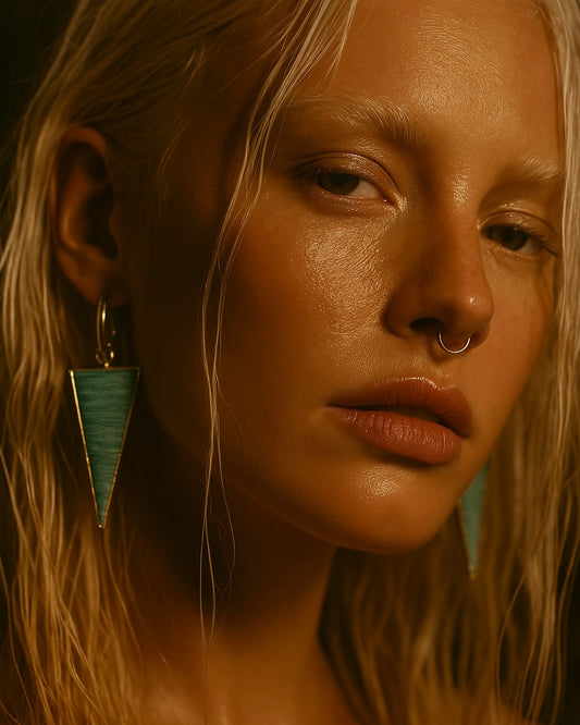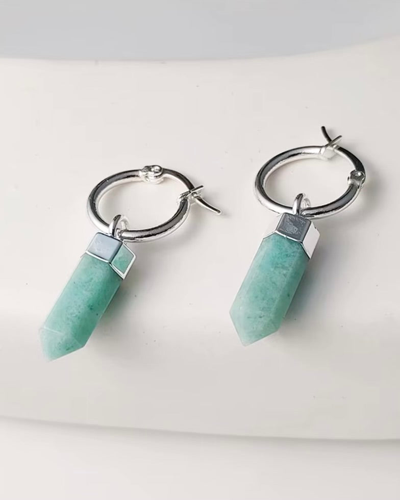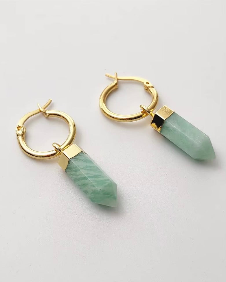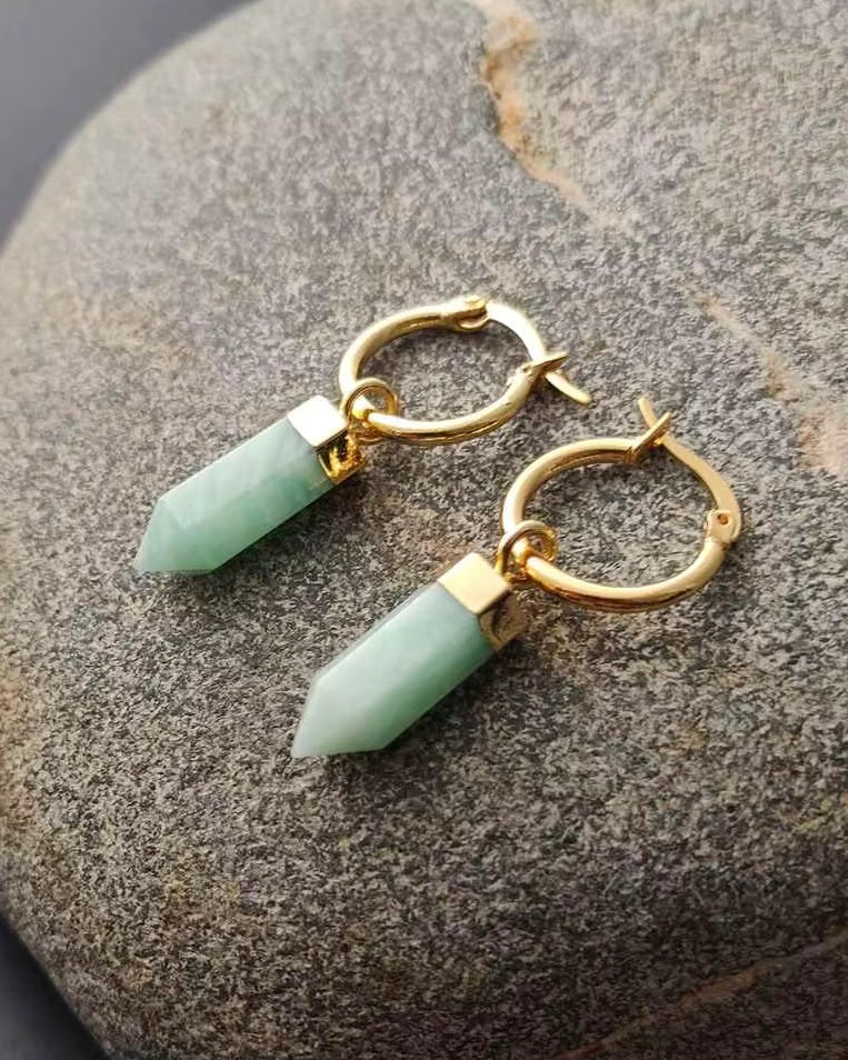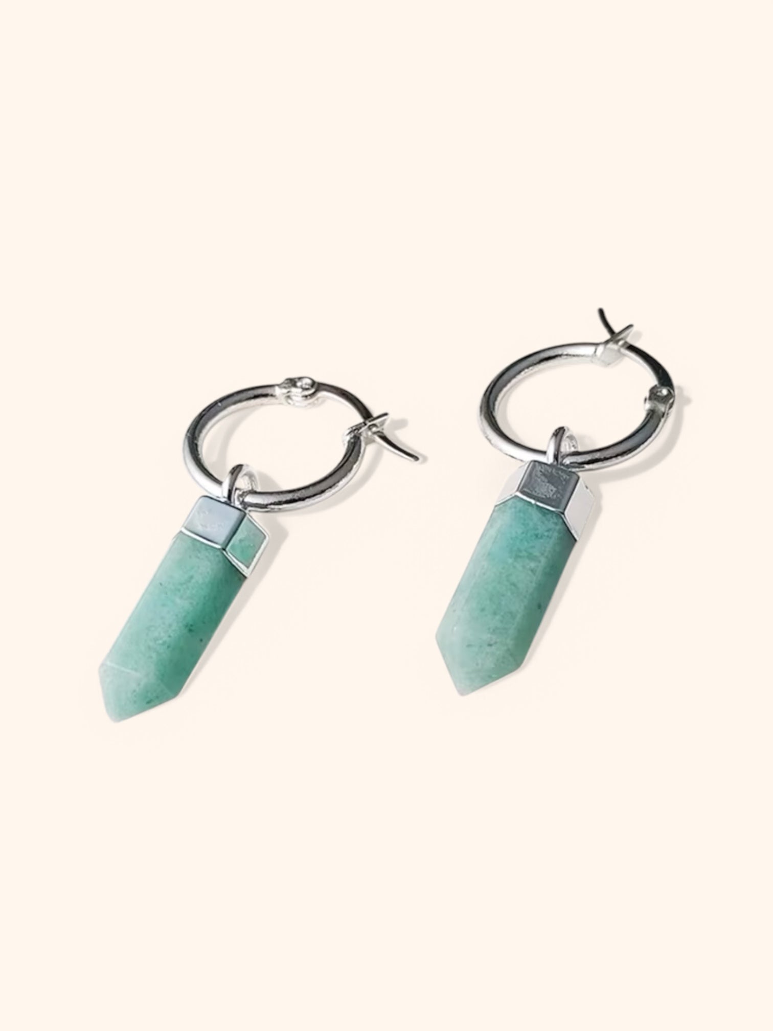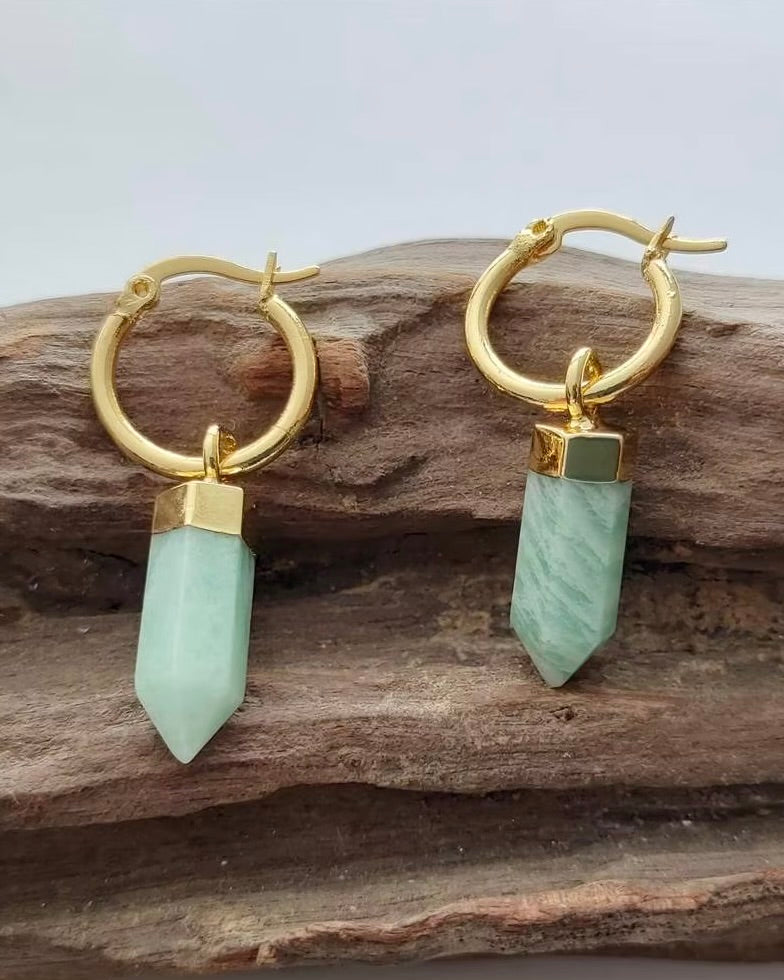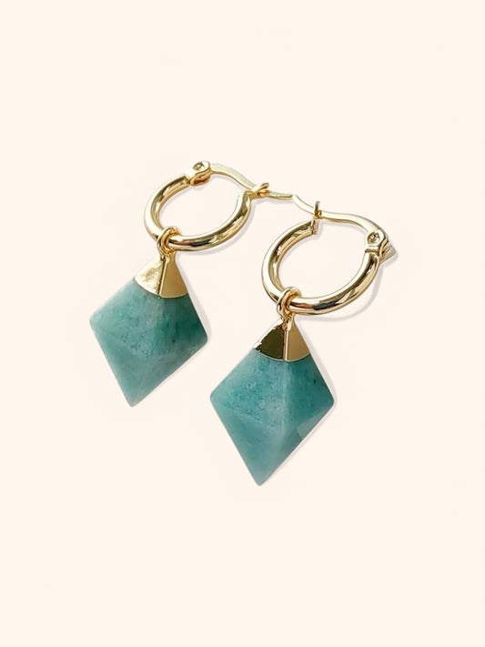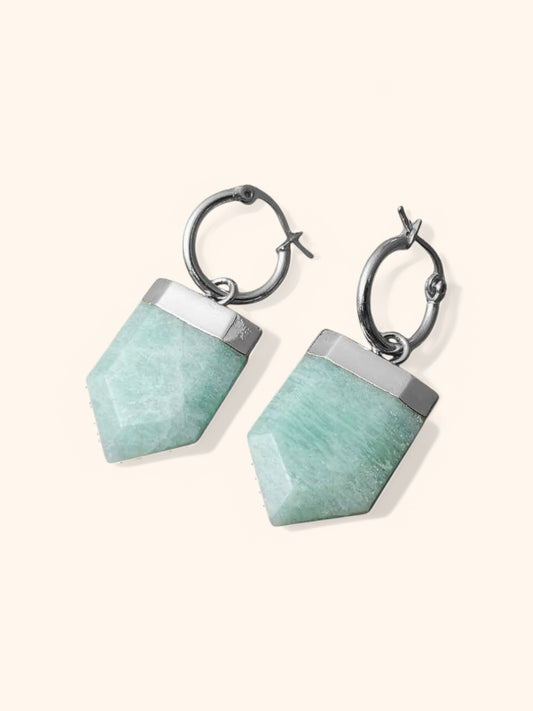 Athena Amazonite Earrings are meticulously handcrafted hoop earrings available in gold or silver, featuring a striking hexagonally-cut Amazonite stone drop inspired by sacred geometry. Amazonite is celebrated for its calming energy and ability to foster emotional balance and self-expression, making it a powerful talisman for inner clarity. Channeling the strategic strength and wisdom of Athena, these earrings are designed to empower the wearer and enhance intuition. The harmonious blend of natural stone and precise geometric design creates an accessory that is both visually captivating and energetically uplifting.