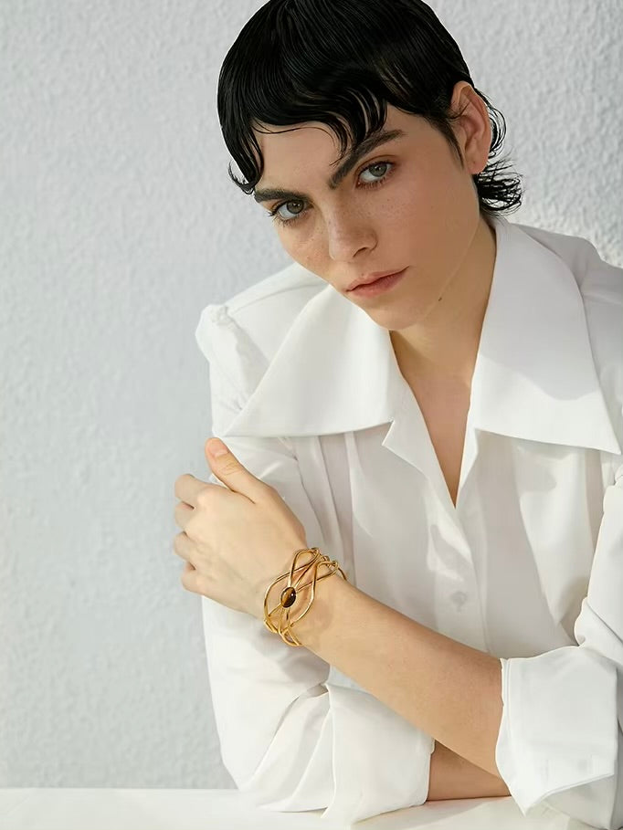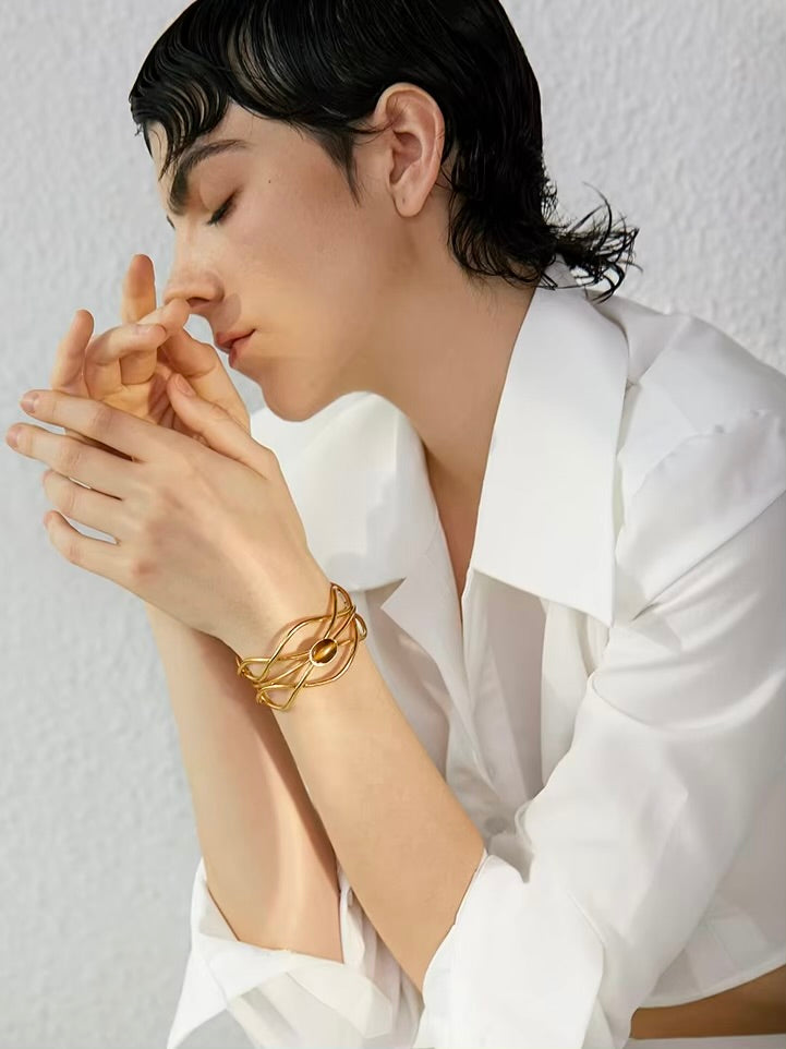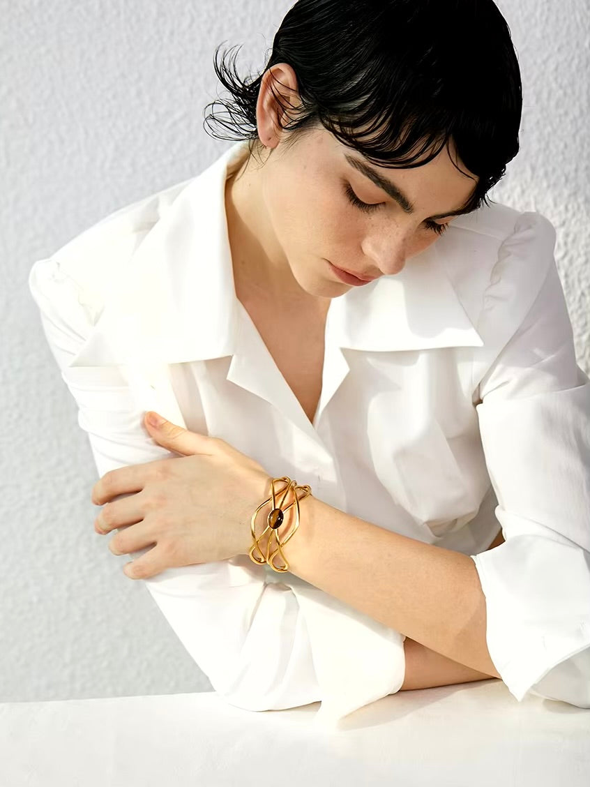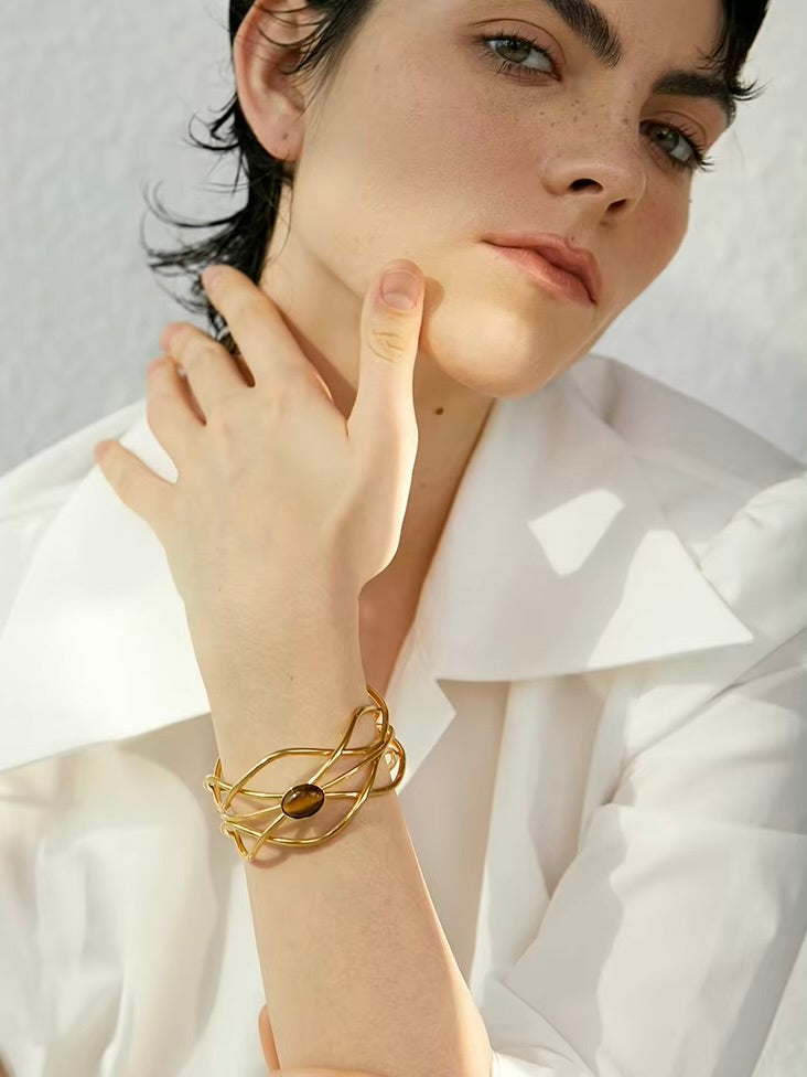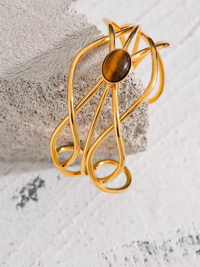 The Baiser Cuff is a striking gold bracelet featuring a bold, geometric open cuff design and a captivating Tiger’s Eye stone centerpiece. This stone is placed to enhance courage and inner strength, adding a touch of élégance and grounding energy to your ensemble.