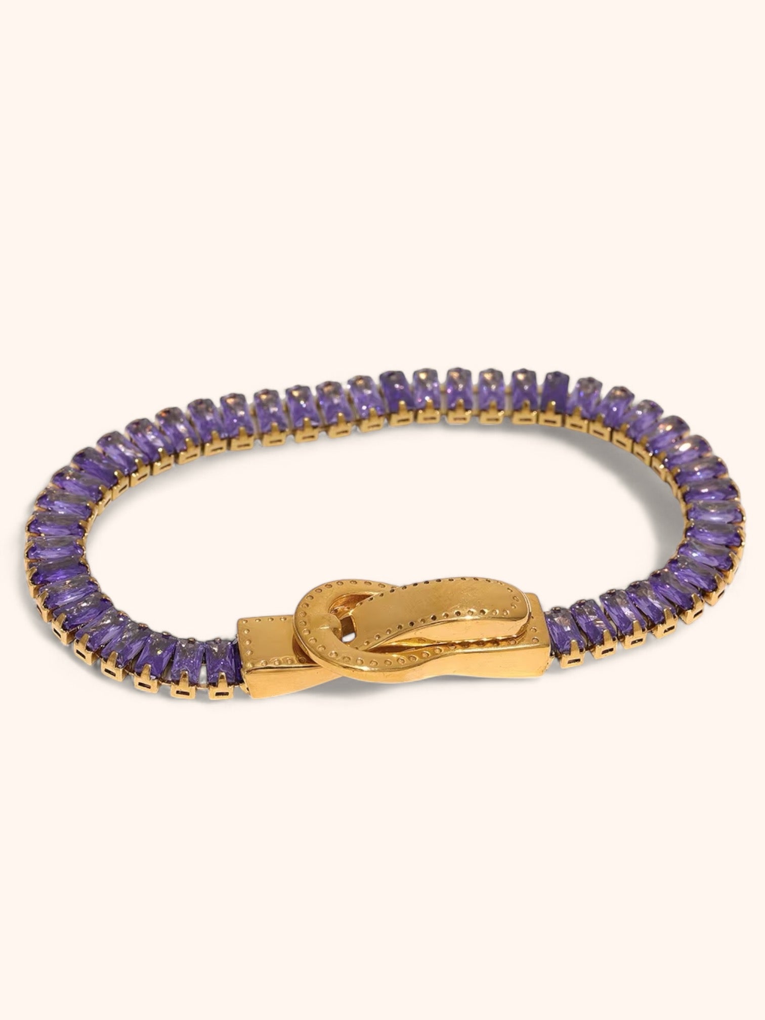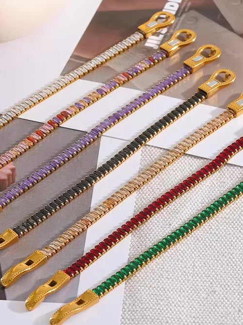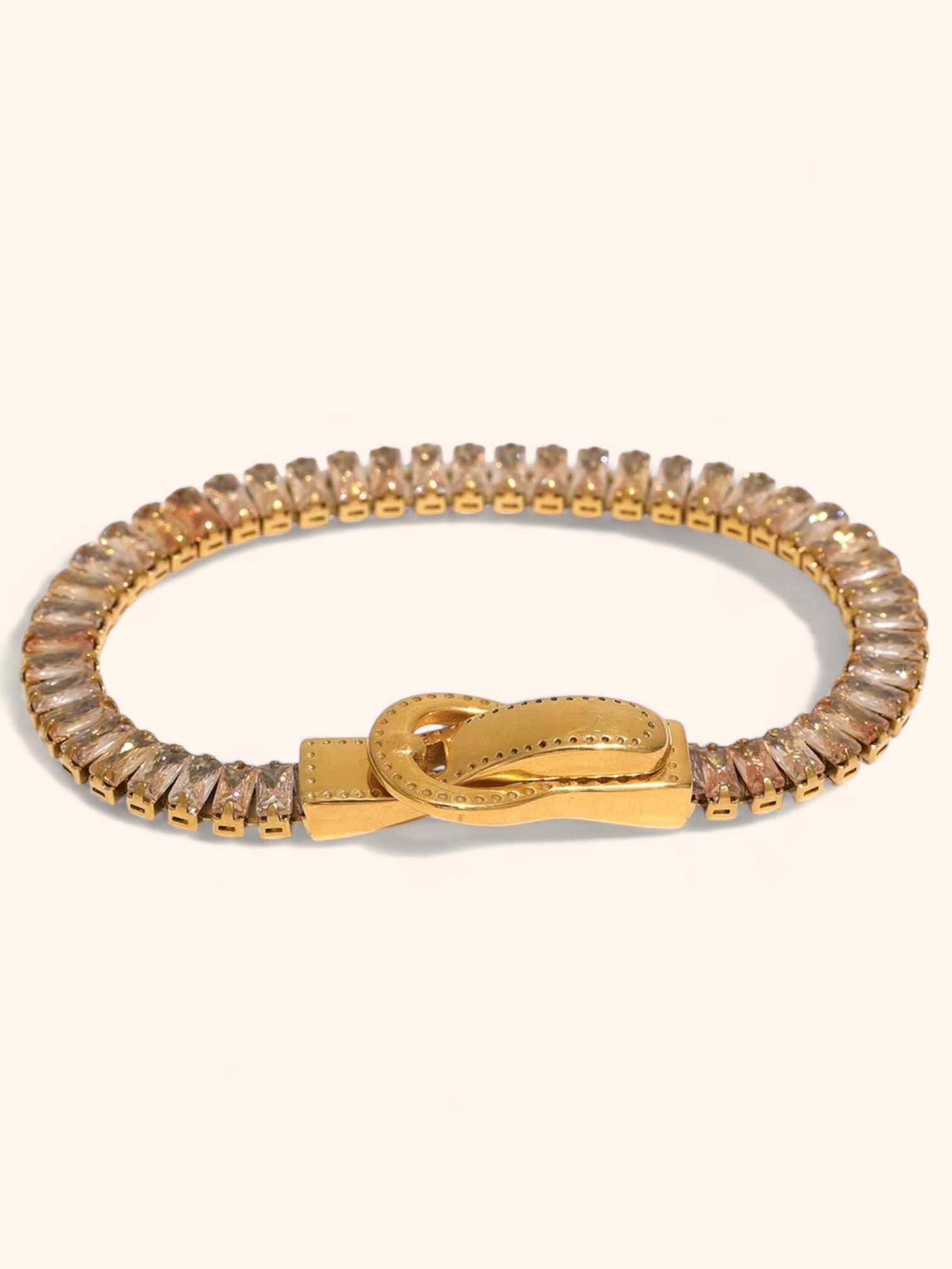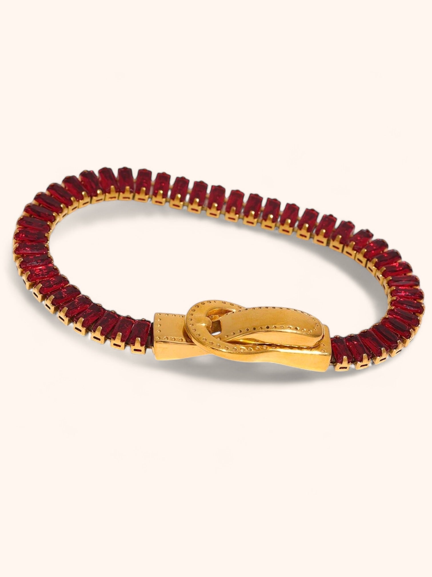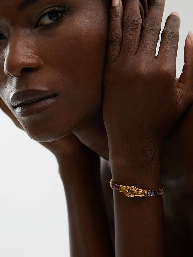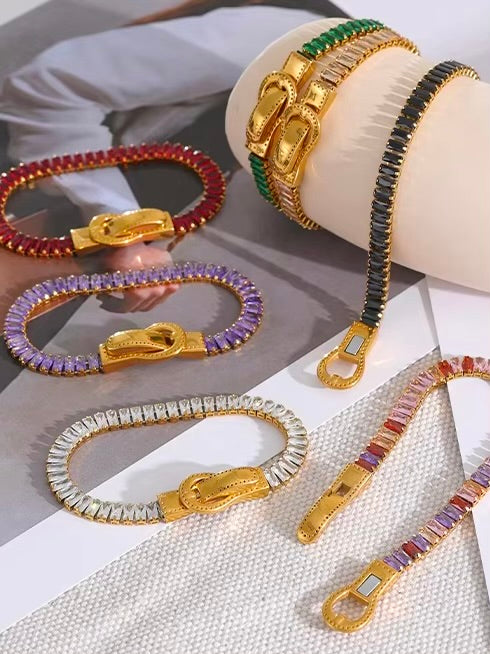 The Brillance Clandestine Bracelet features a stunning gold chain adorned with a row of shimmering crystals in various hues. This exquisite gold clasped piece adds a touch of brillance and sophistication, perfect for elevating any ensemble.