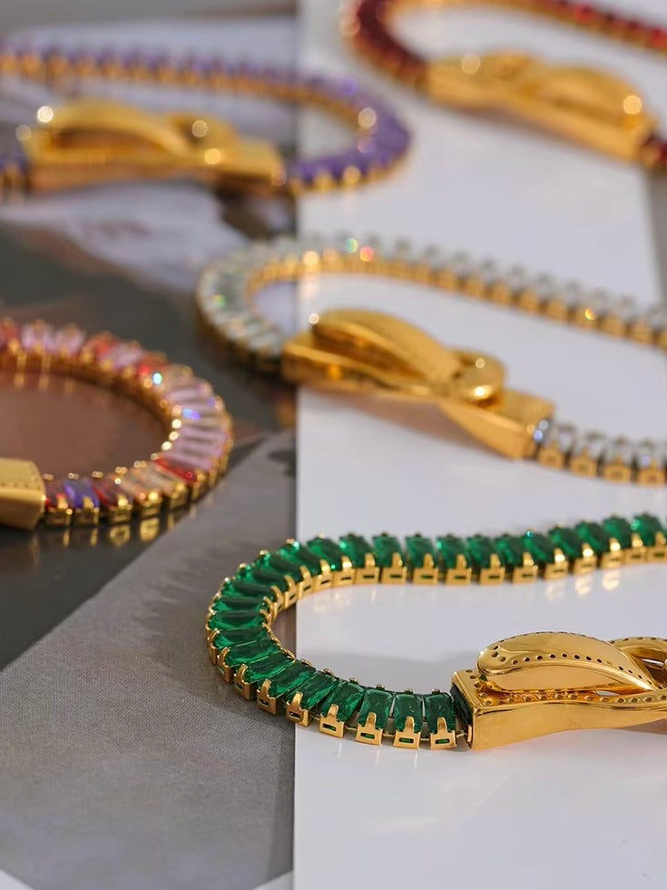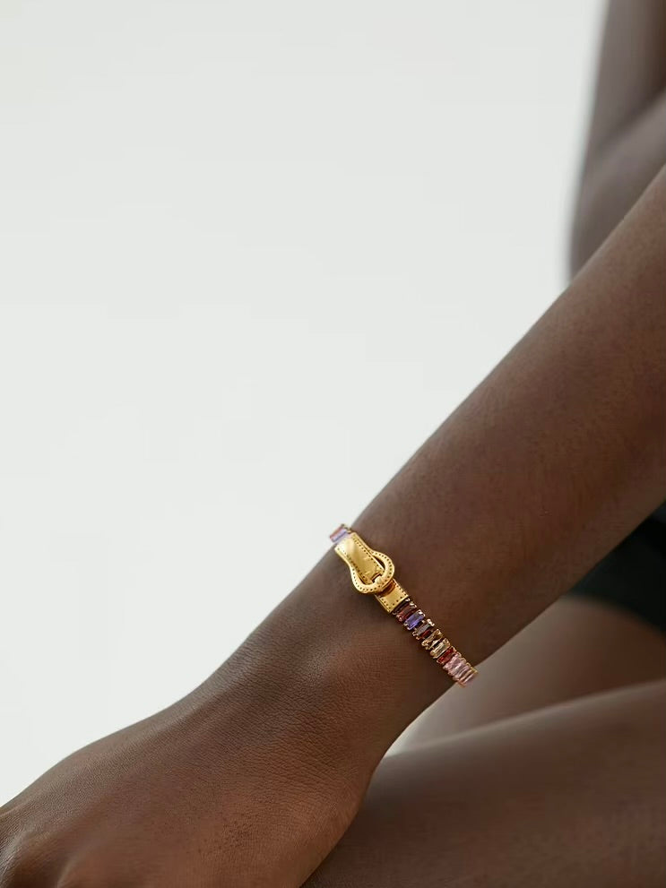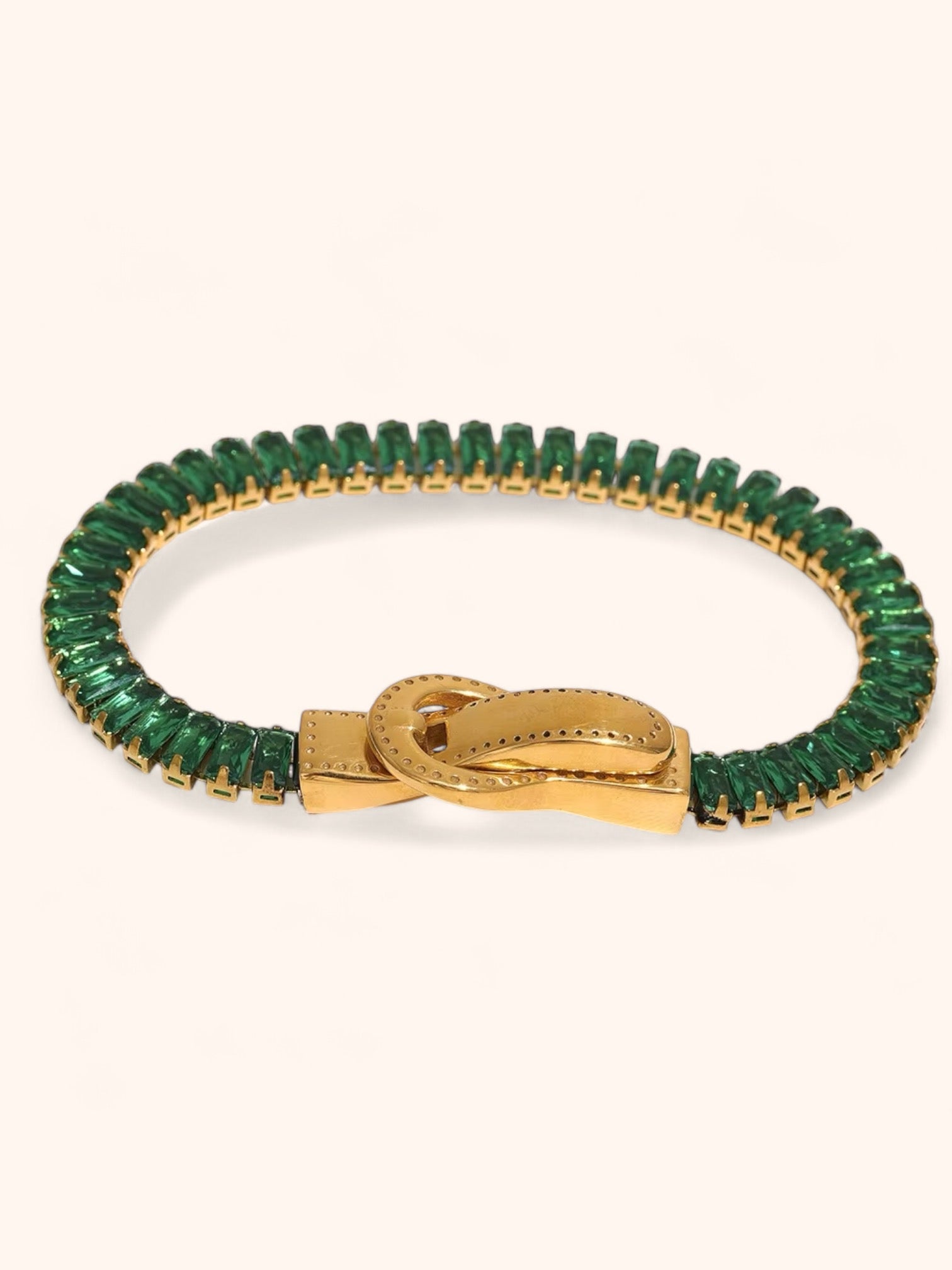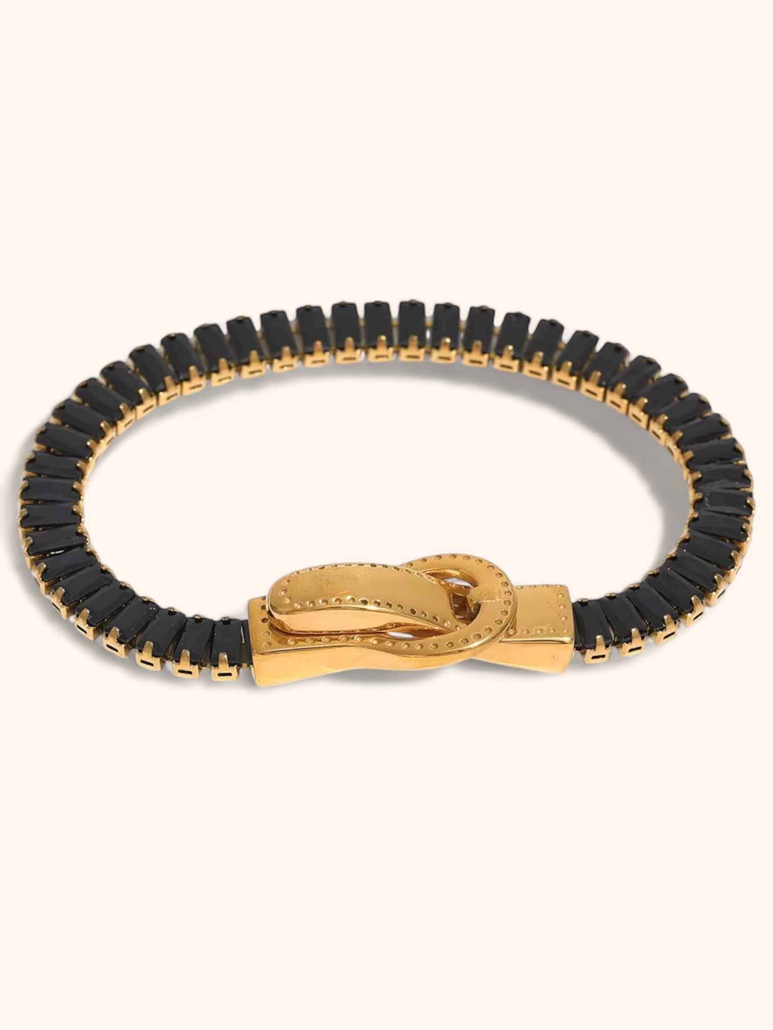 The Brillance Clandestine Bracelet features a stunning gold chain adorned with a row of shimmering crystals in various hues. This exquisite gold clasped piece adds a touch of brillance and sophistication, perfect for elevating any ensemble.