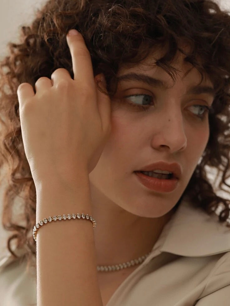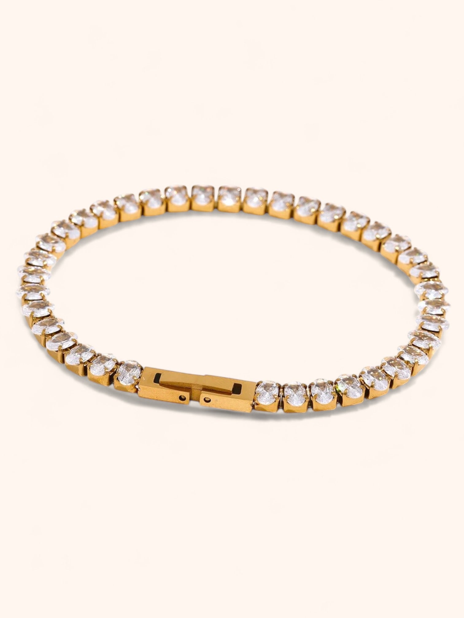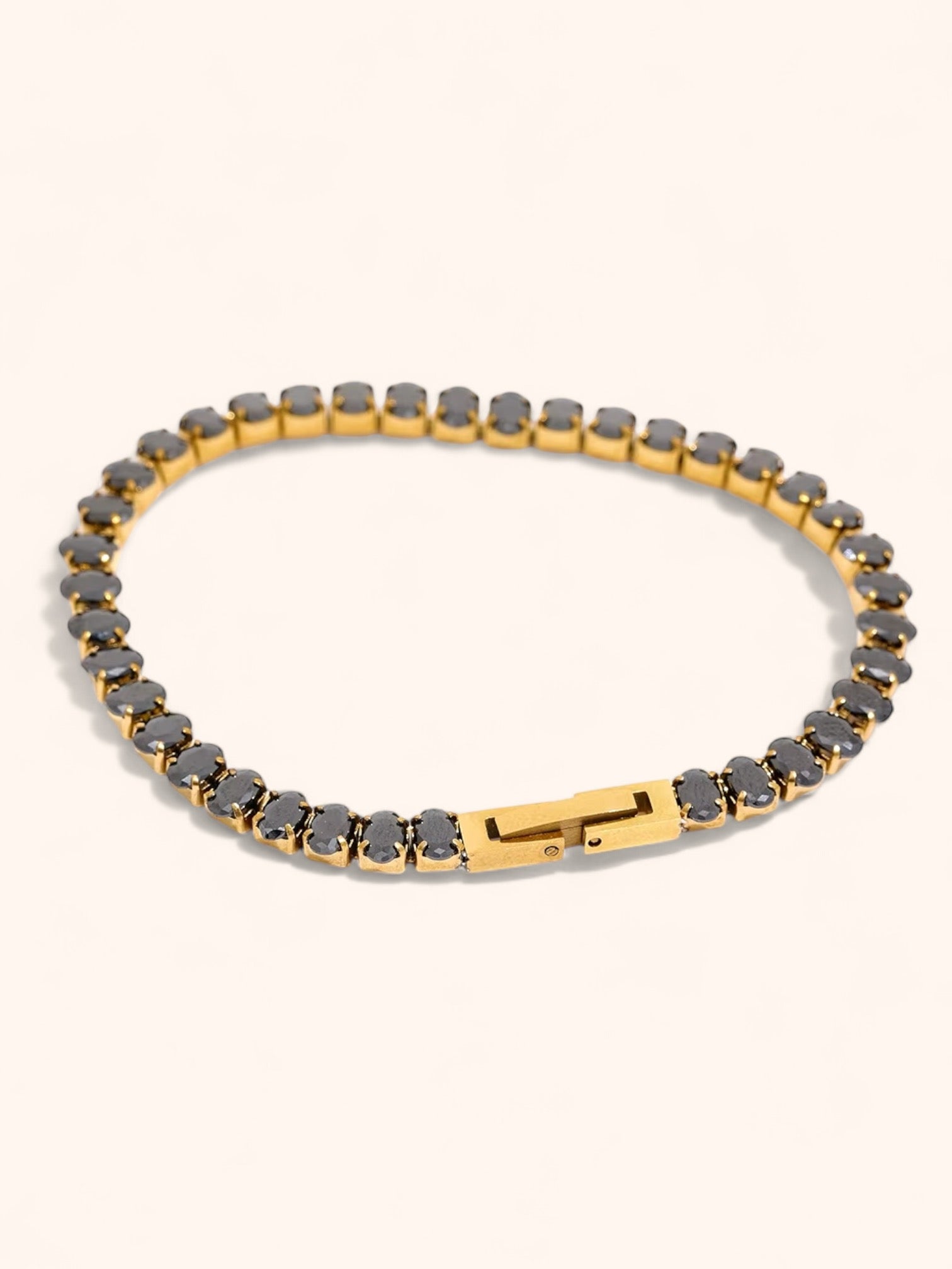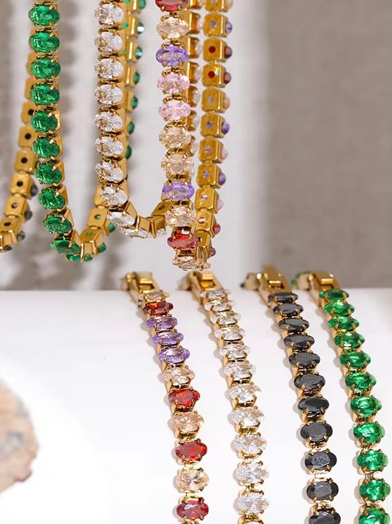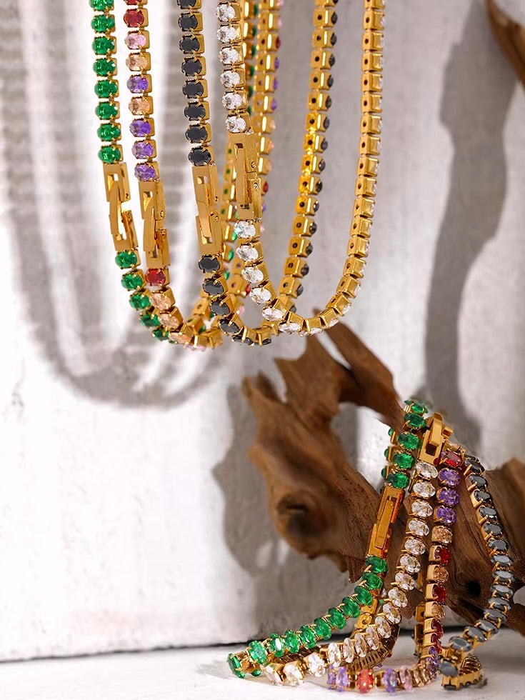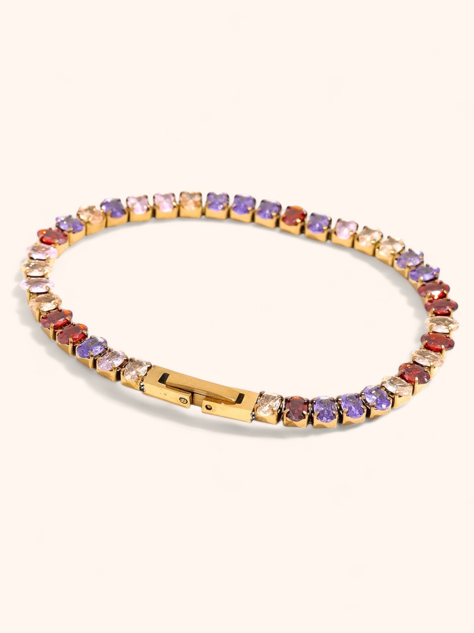The Cannes Bracelet showcases a graceful gold tennis chain, adorned with shimmering gemstones available in multiple colors. Its refined design makes it a versatile piece, perfect for layering or standing out on its own. The bracelet drapes beautifully on the wrist, adding a subtle touch of luxe to any ensemble.