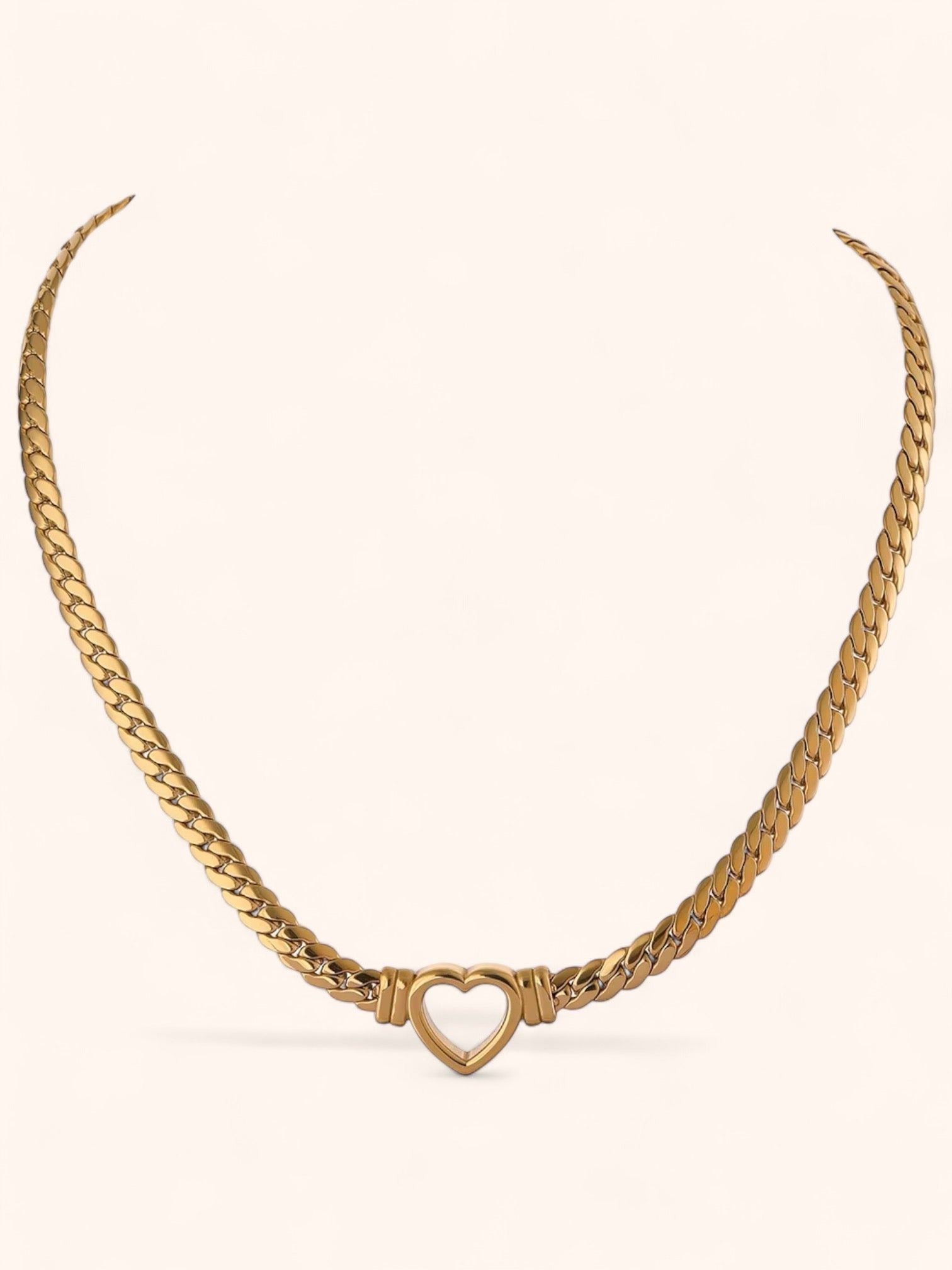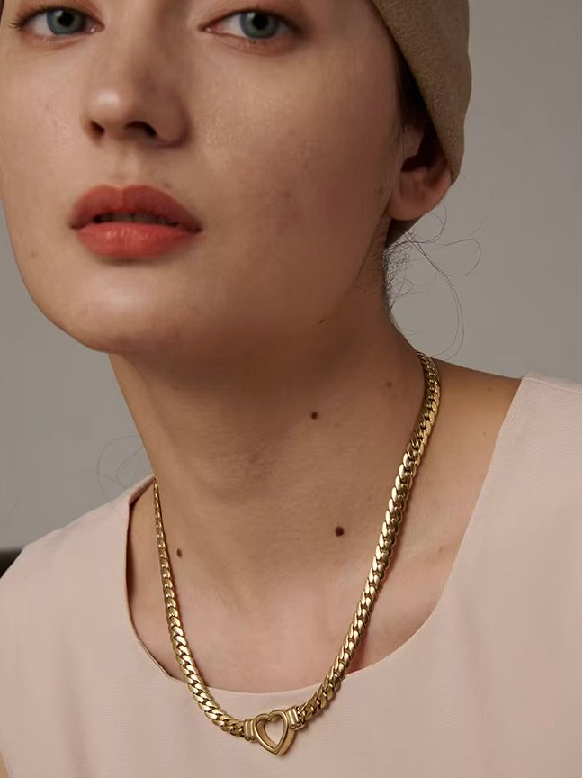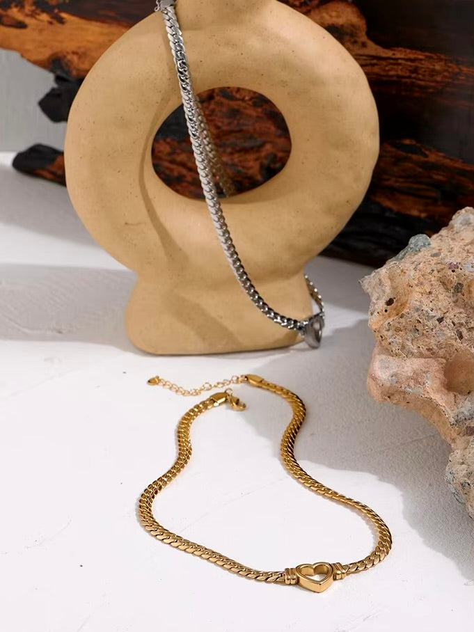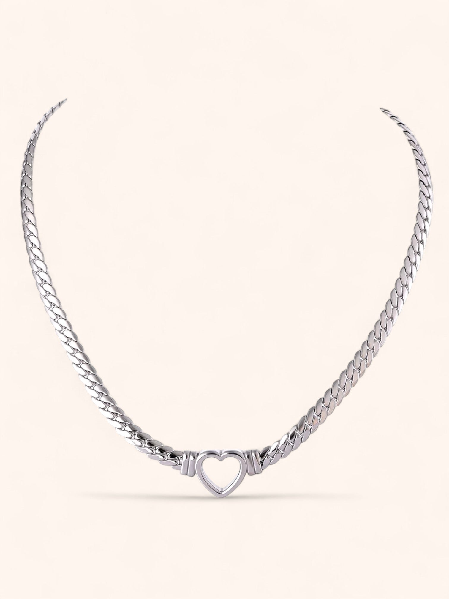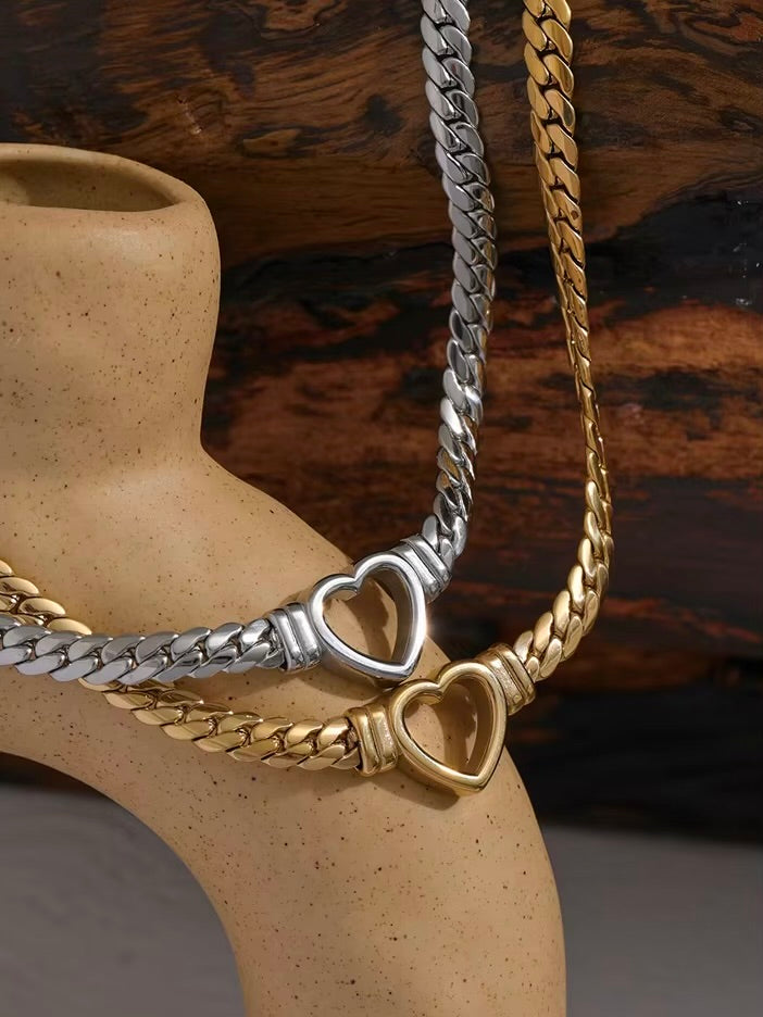 Adorn your décolleté with the Chaîne d'Amour Necklace, featuring a sleek flat Cuban chain in gold or silver, elegantly complemented by a radiant heart pendant. This exquisite piece effortlessly combines modern design with a romantic touch, making it a timeless accessory for any occasion.