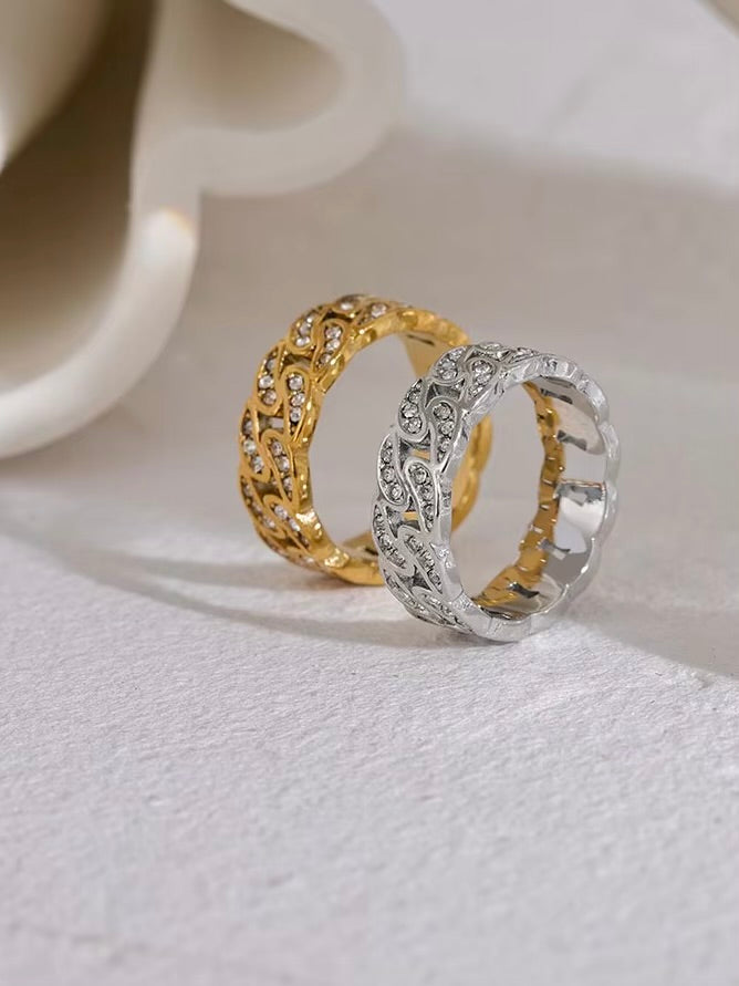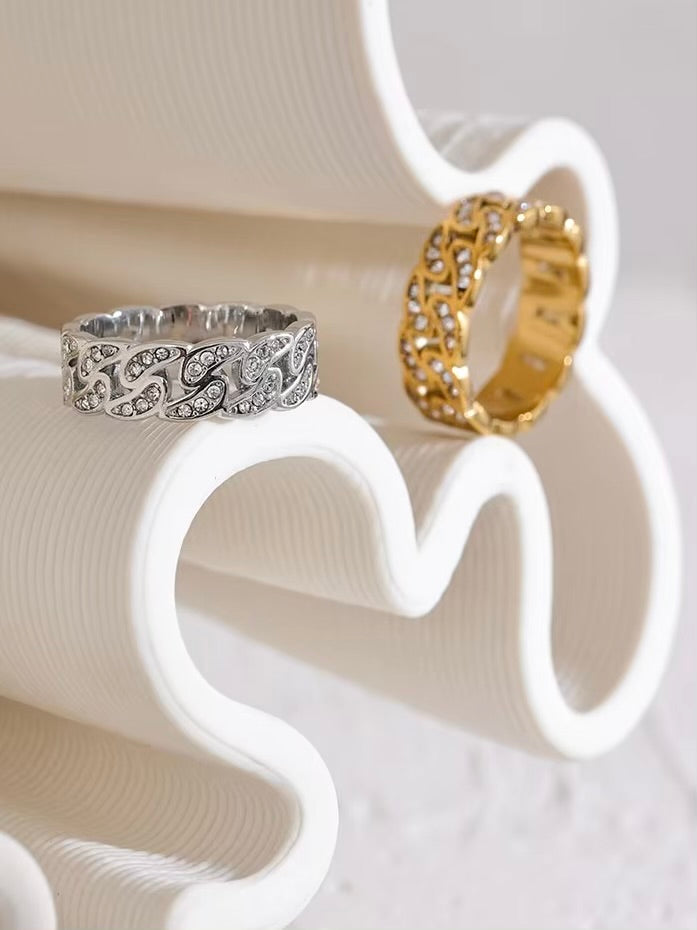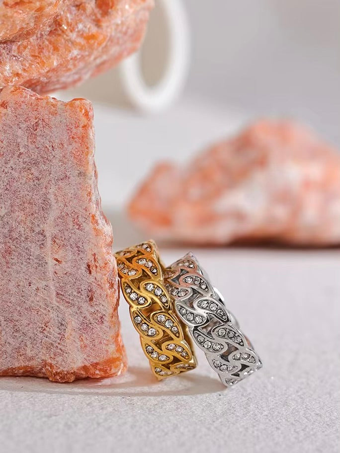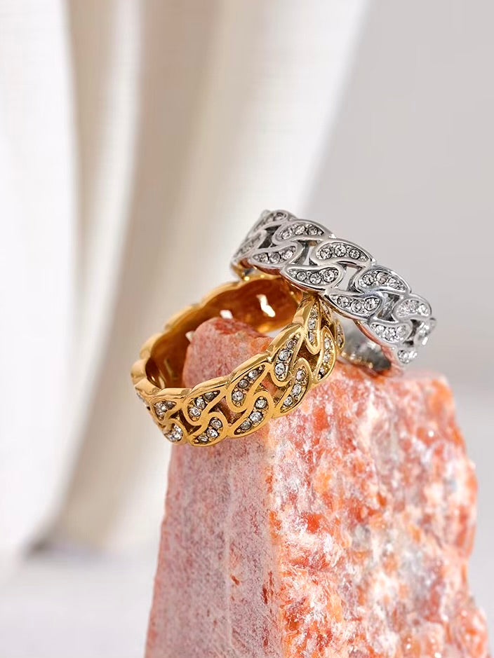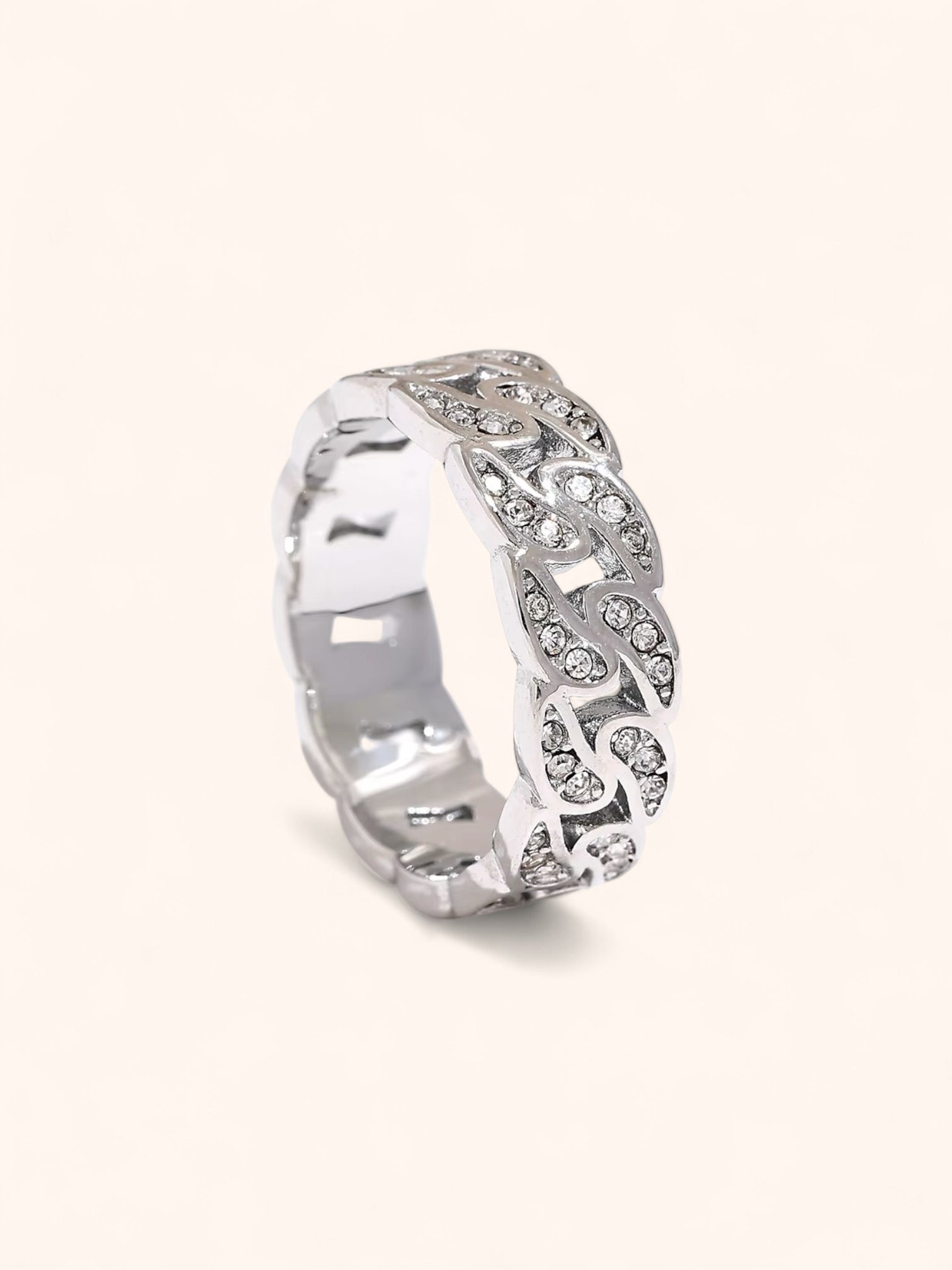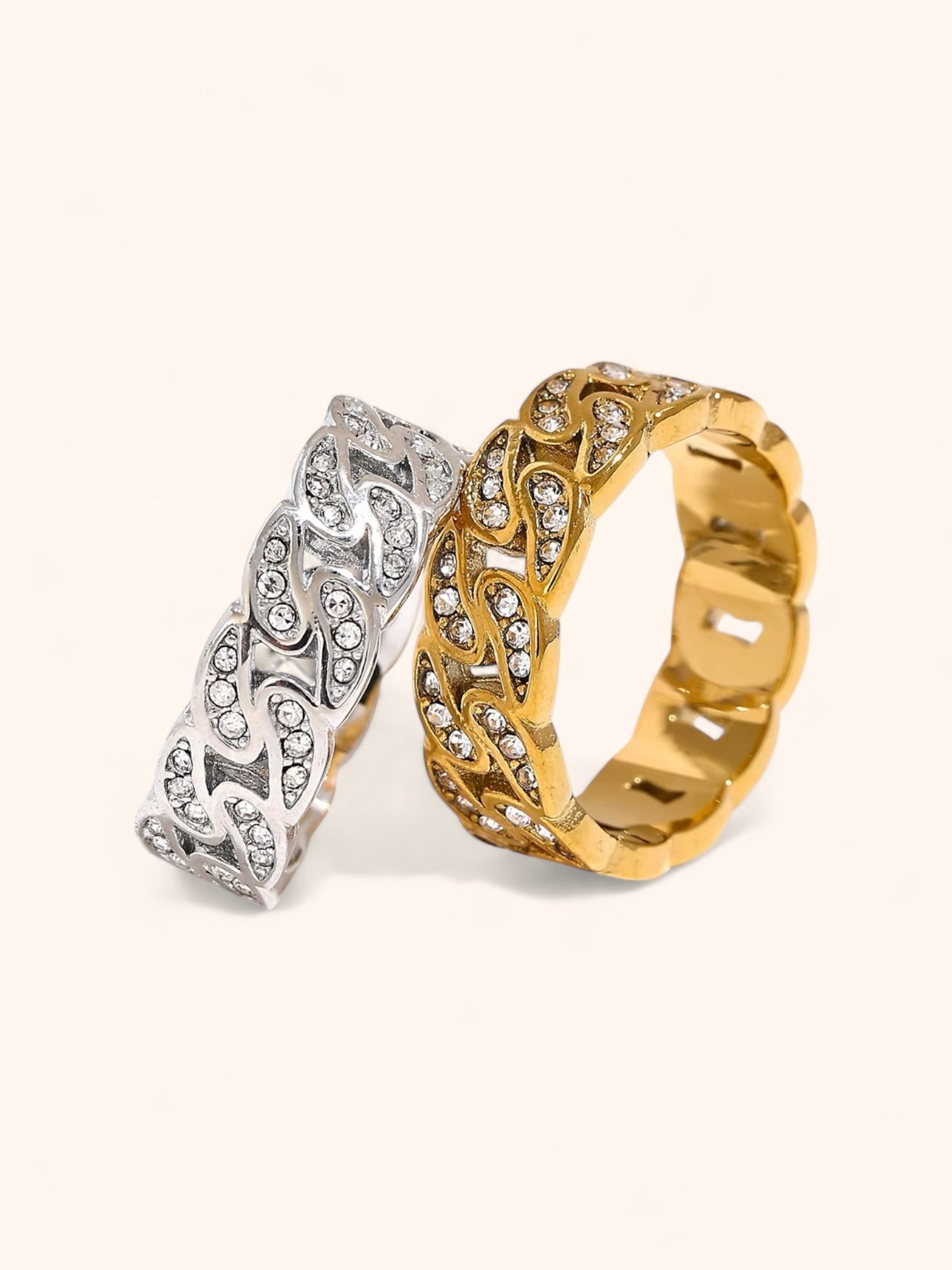 Embrace the allure of the Chant de Sirène Ring, a striking Cuban chain design adorned with shimmering inlaid crystals. This statement piece elevates any ensemble, exuding a captivating elegance that echoes timeless beauty.