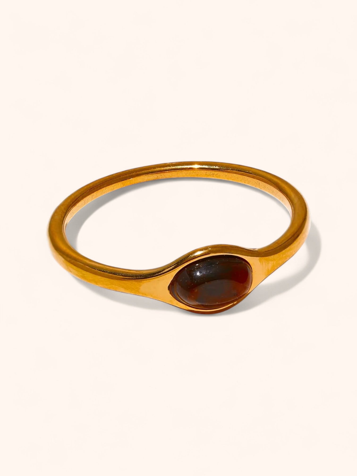 This exquisite Ciel d’Orage Ring features a minimalist gold band adorned with a striking tigers eye center stone, embodying both elegance and strength. Perfect for stacking, this piece adds a touch of éclat to any ensemble.