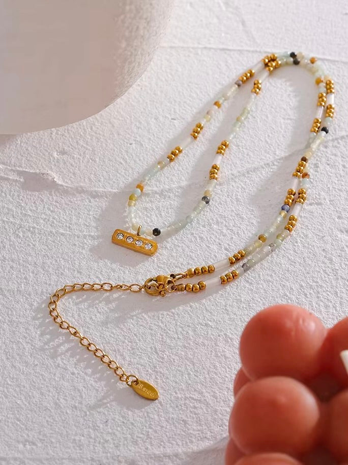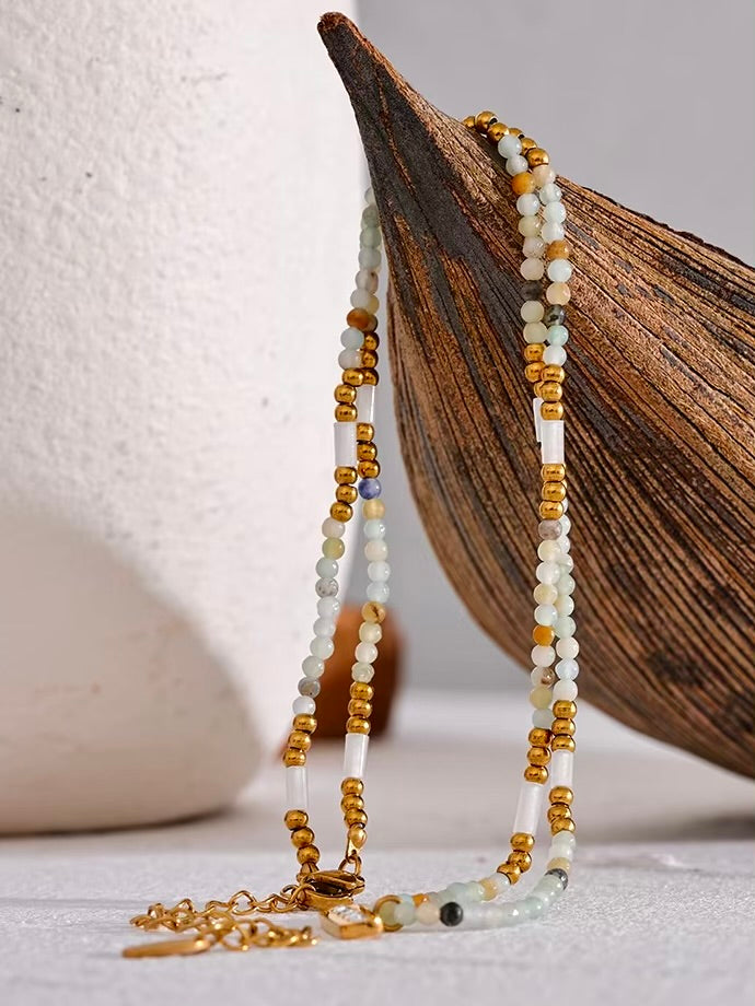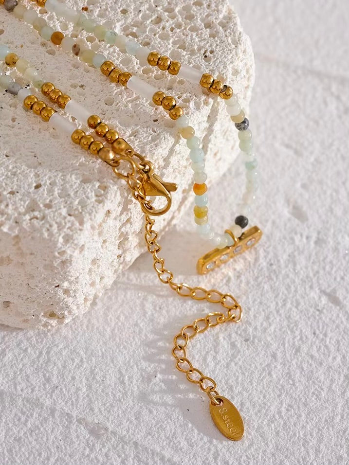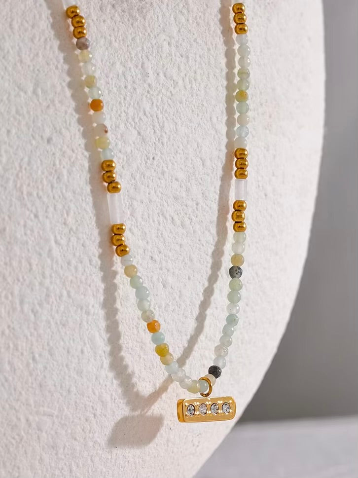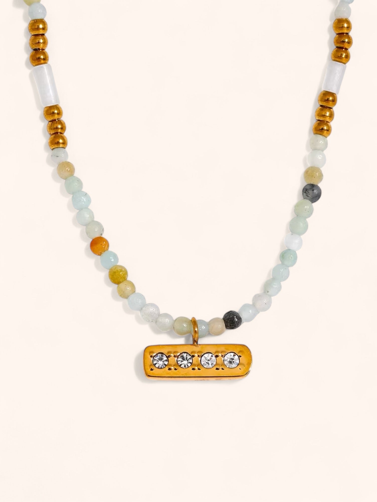 The Clarisse Necklace is a harmonious blend of energy and elegance, featuring natural Amazonite and Yellow Jasper beads, each chosen for their powerful holistic properties. Amazonite, known as the "Stone of Courage," soothes the spirit, enhances communication, and promotes emotional balance, while Yellow Jasper is revered for its grounding energy, instilling confidence and inner strength. Centered by a radiant gold pendant inlaid with shimmering crystals, this necklace is a statement of balance, empowerment, and luminous beauty.