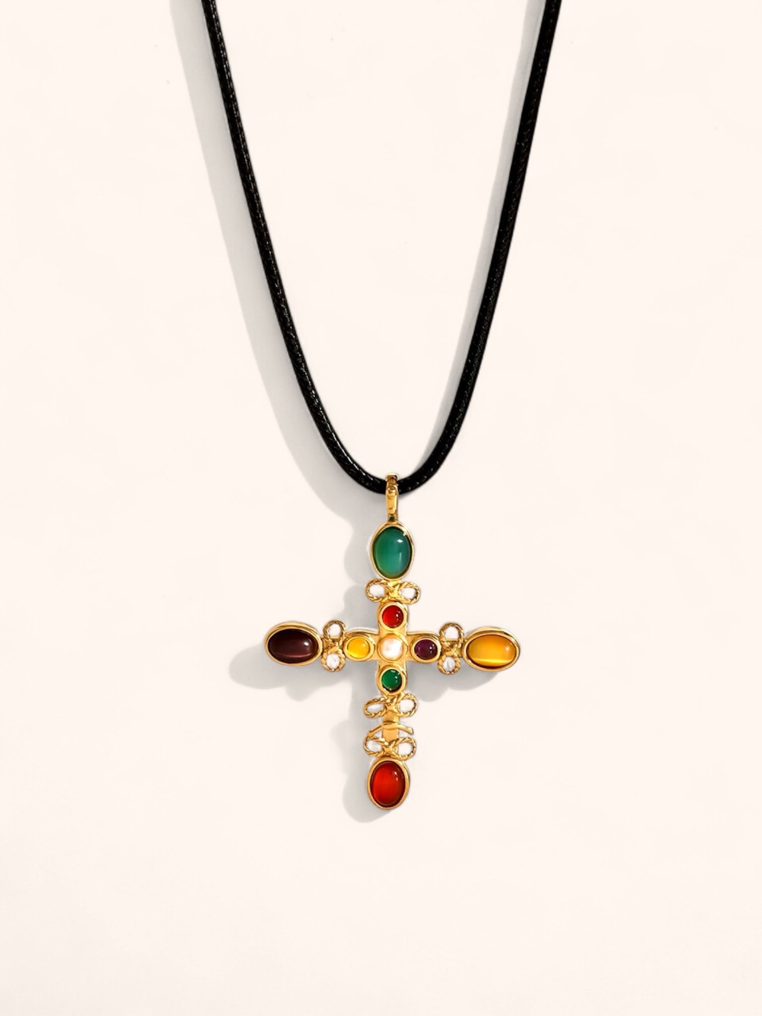 This necklace features a bold, sleek black rope paired with a striking cross pendant set with a natural stone, creating a timeless symbol of strength and grace. Its radiant charm, accentuated by nacre detailing, offers a seamless fusion of modern and classic elegance.