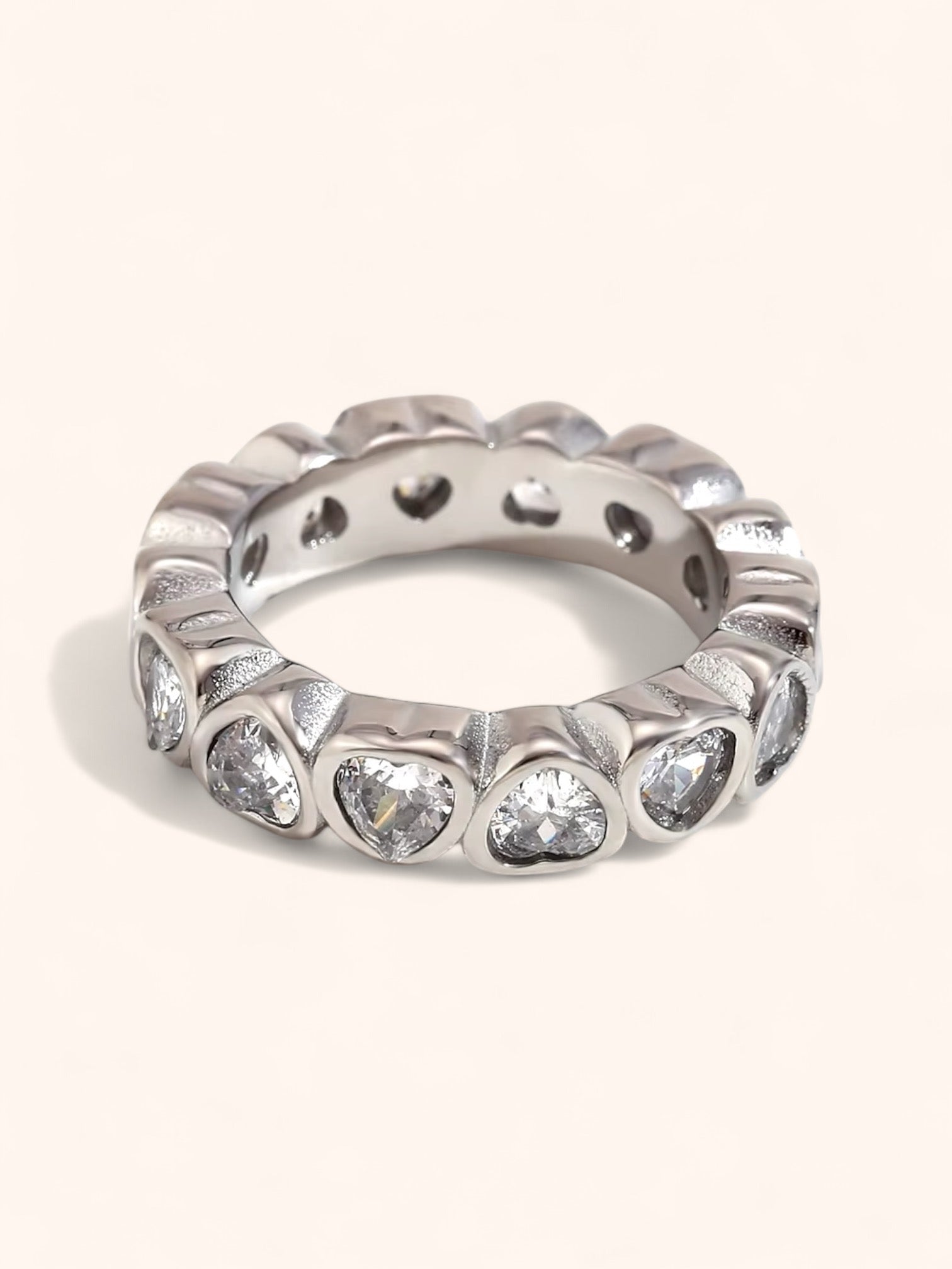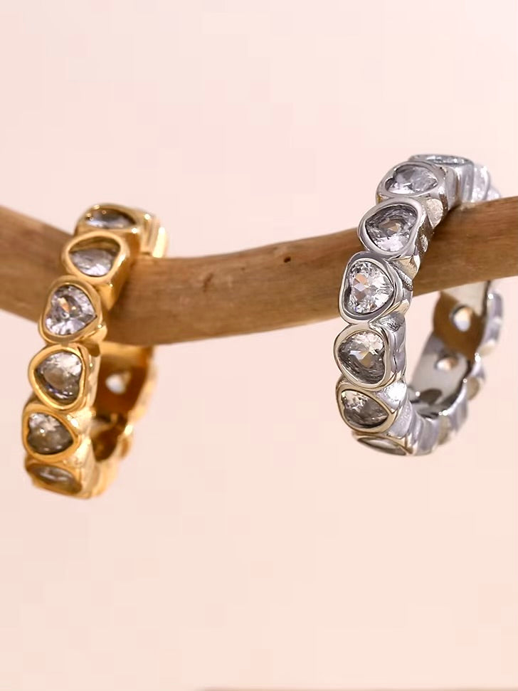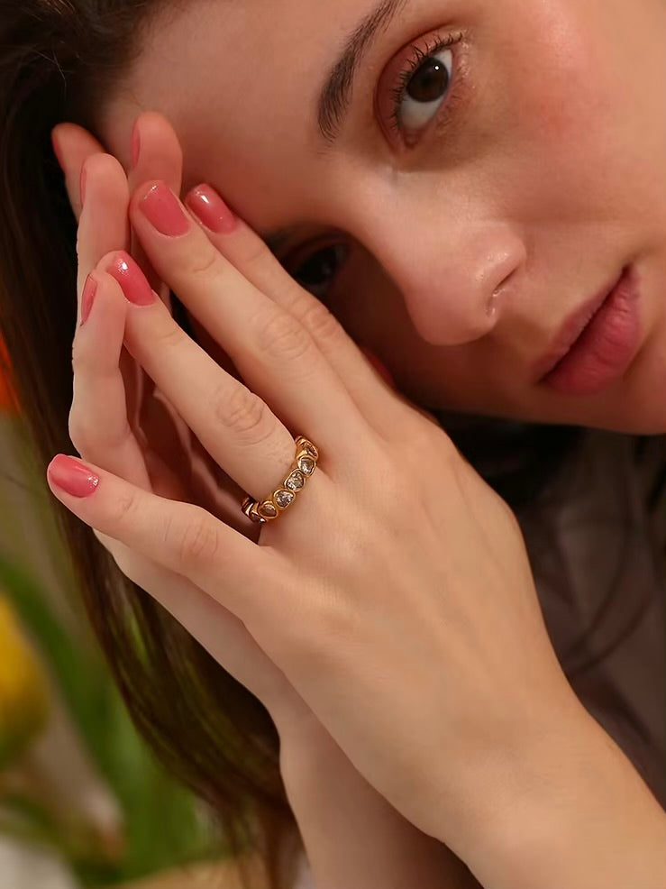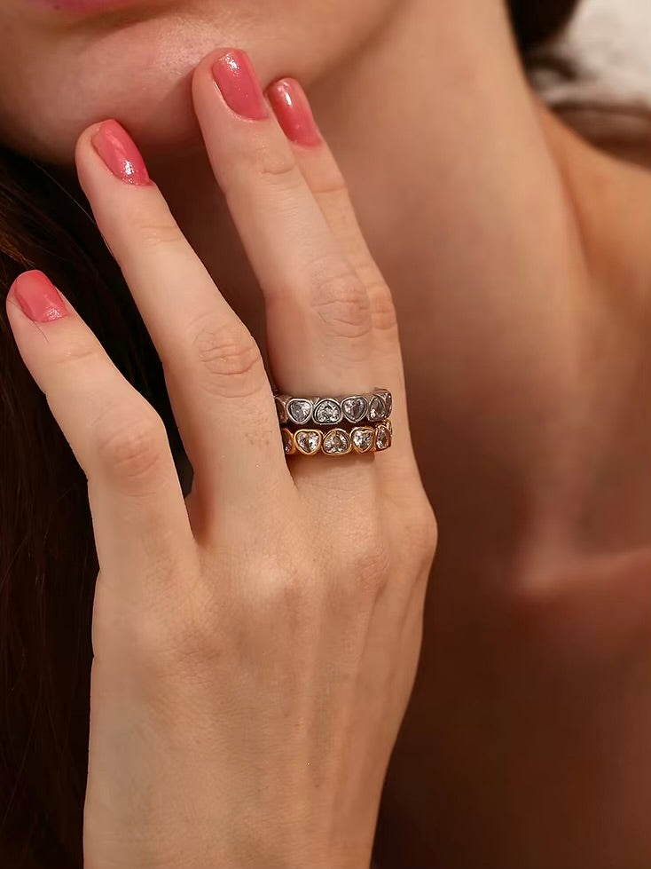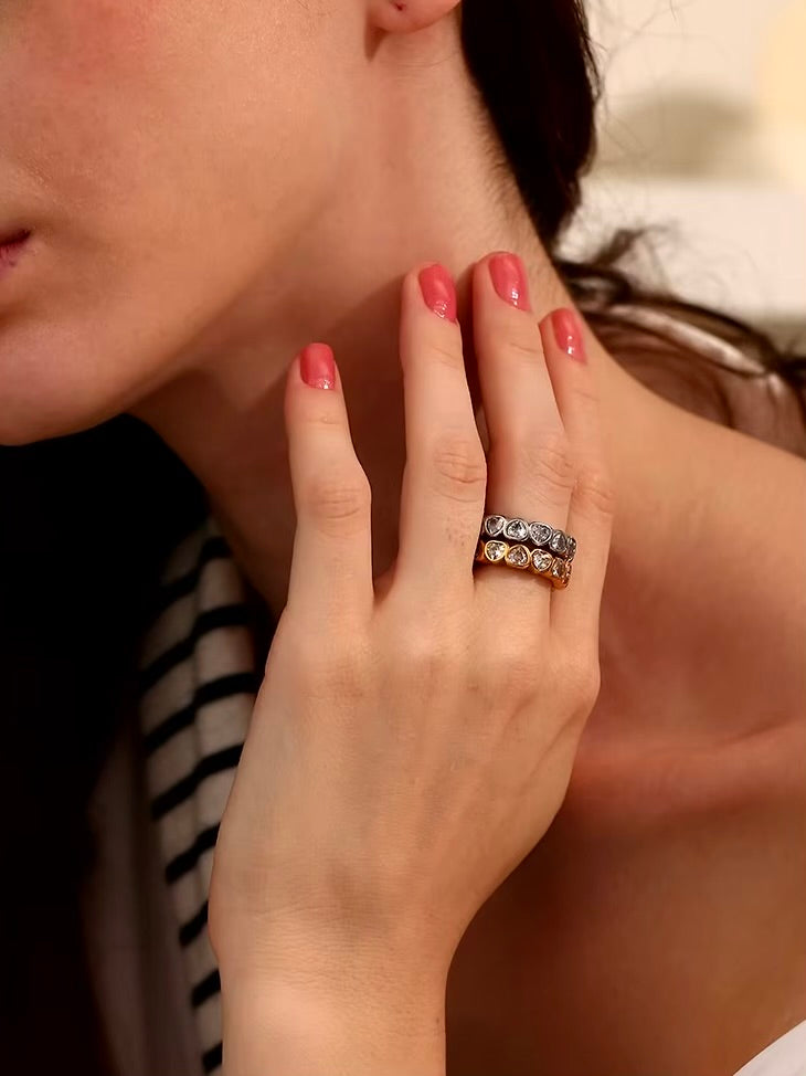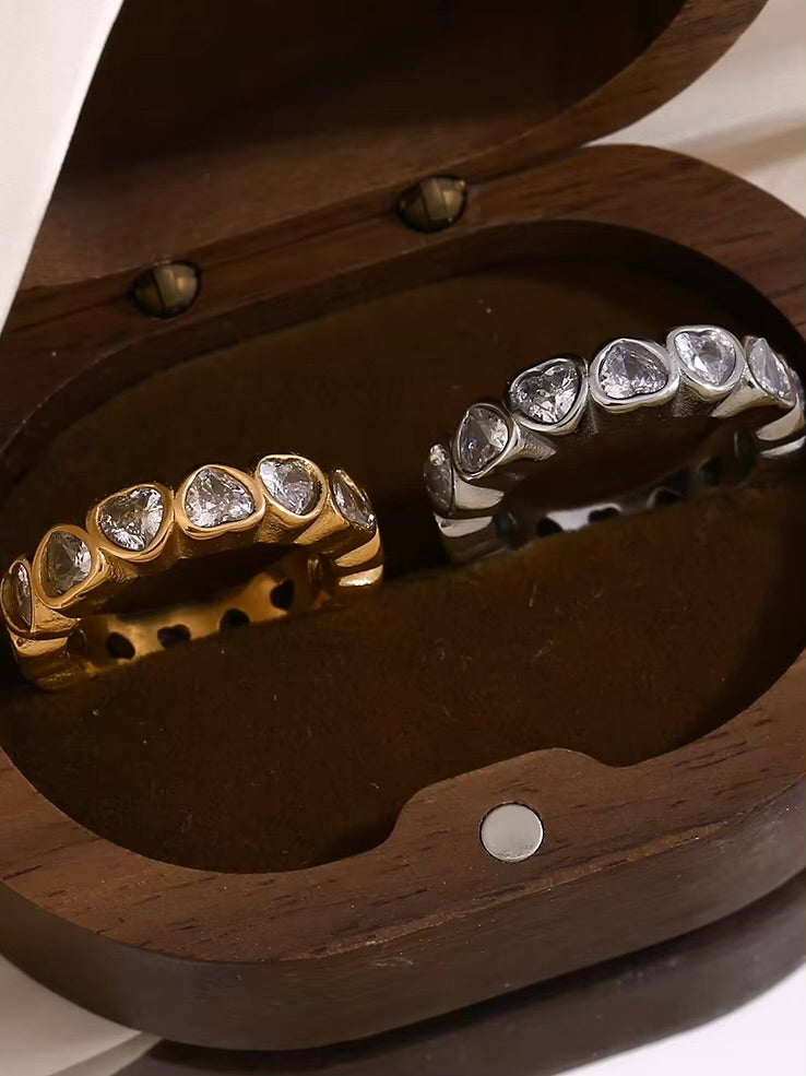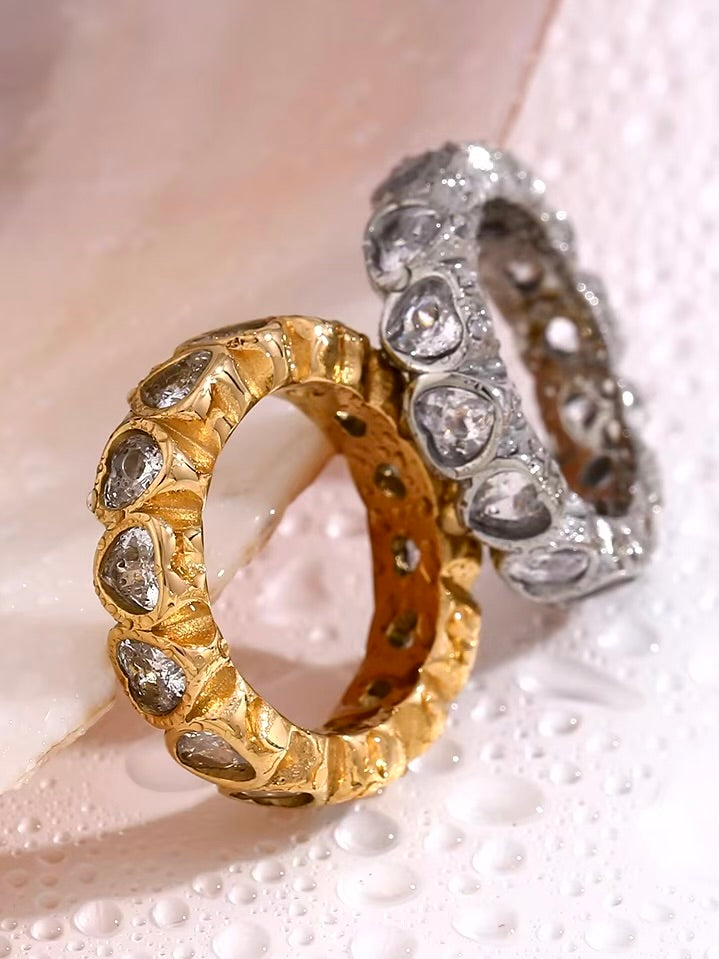 Crafted in a detailed textured band, the Compassion Ring features exquisite inlaid heart-shaped crystals that embody love and elegance. Available in gold or silver, this piece beautifully accentuates any ensemble with its charming allure.