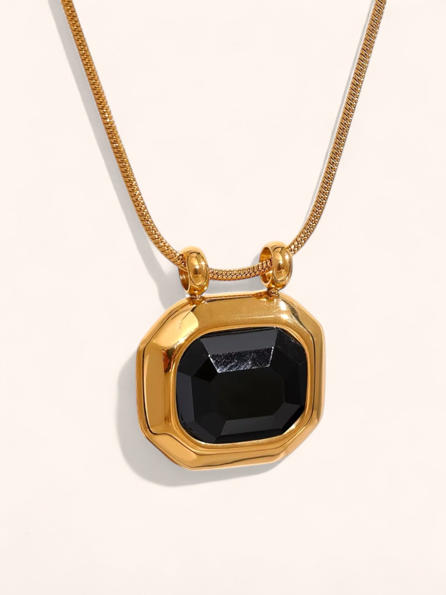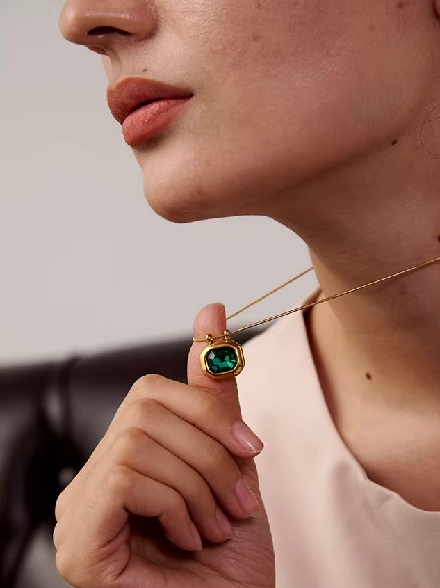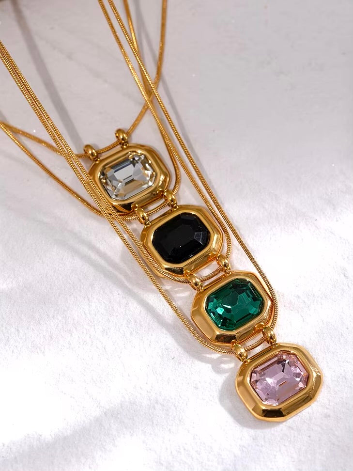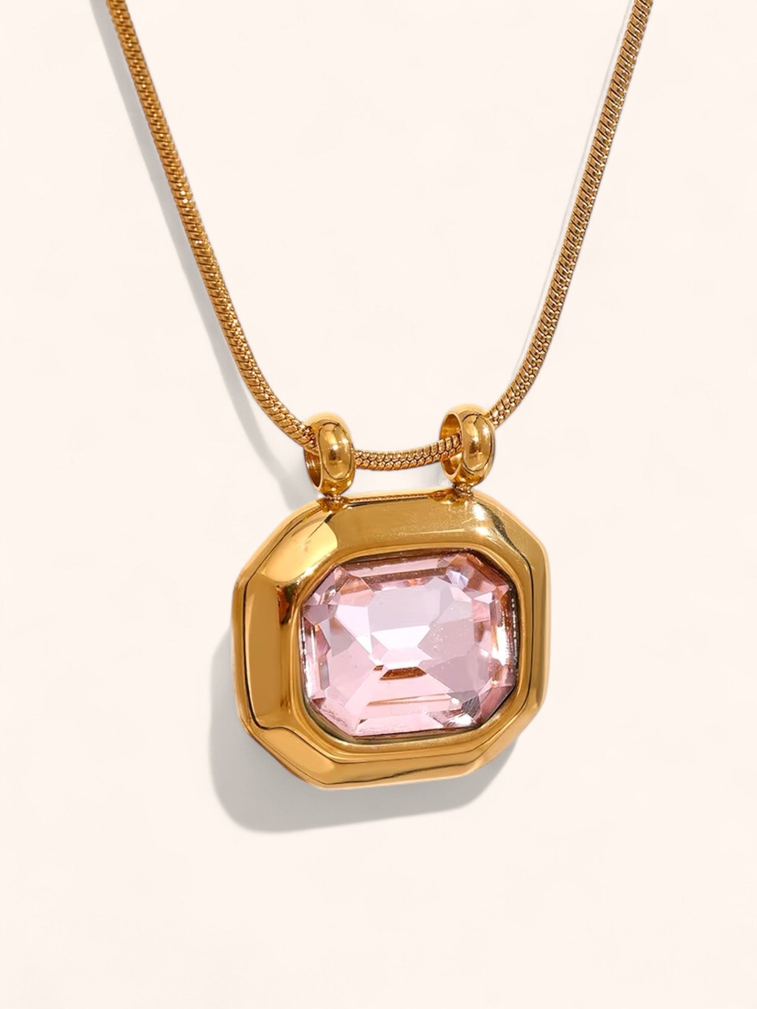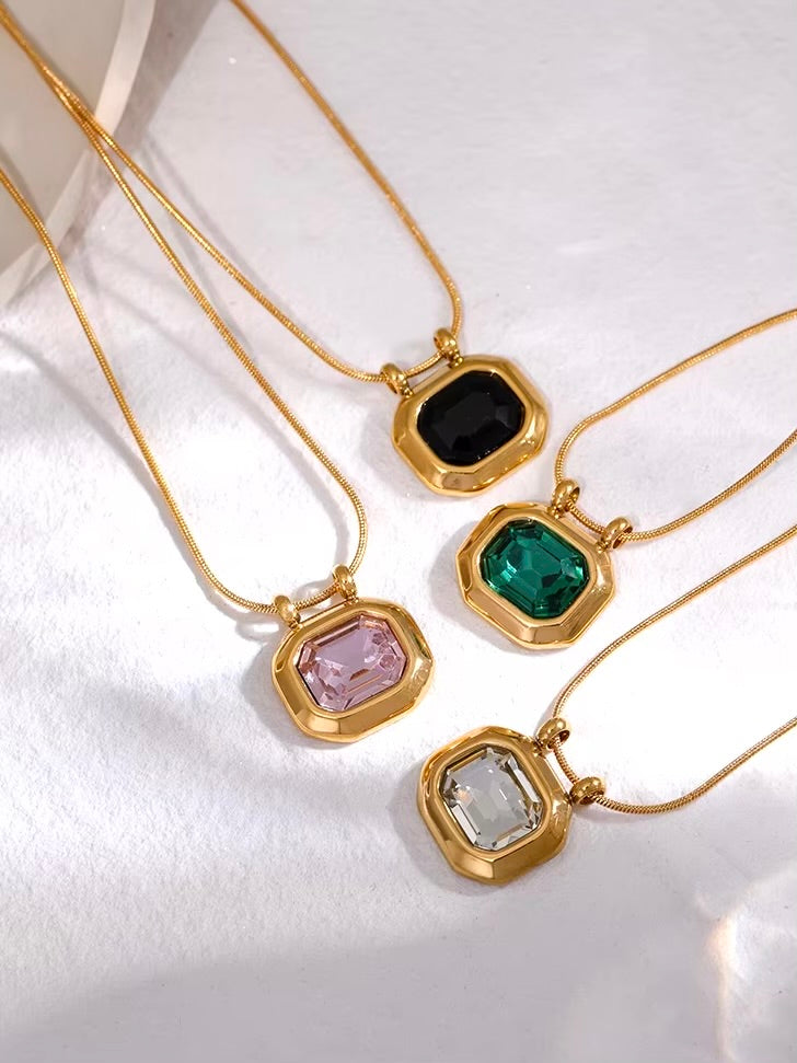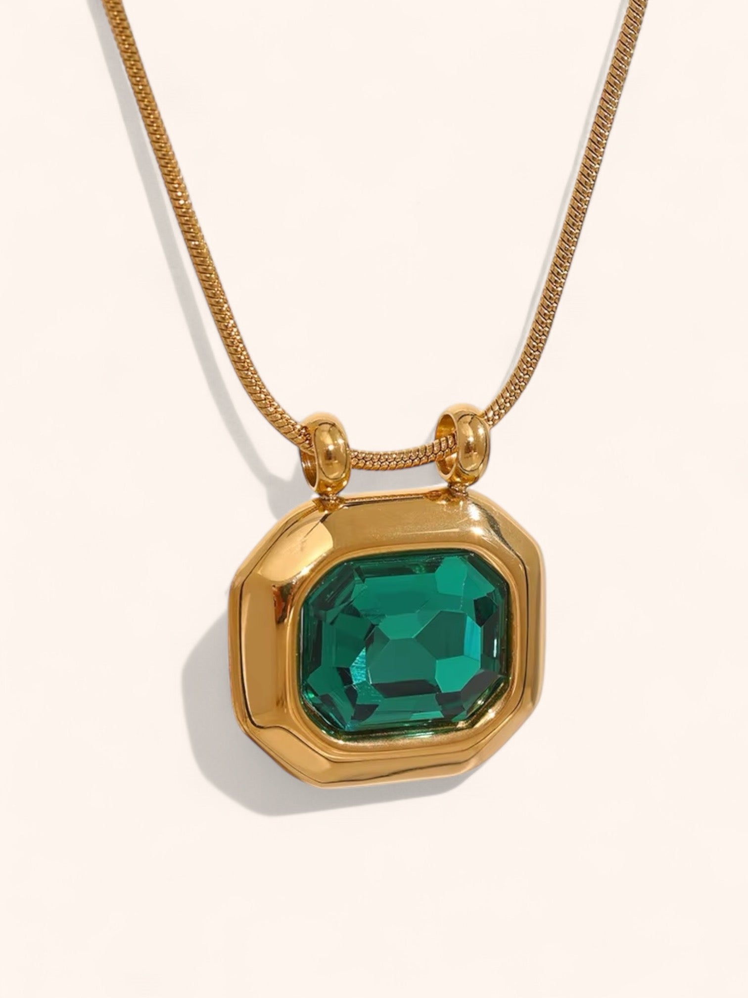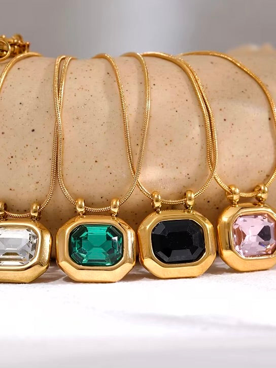 The Enchanté Necklace features a sleek gold chain adorned with a dazzling gemstone pendant, offering a touch of enchantement in multiple vibrant hues. Perfectly balanced between elegance and allure, this necklace is a timeless statement for any occasion.
