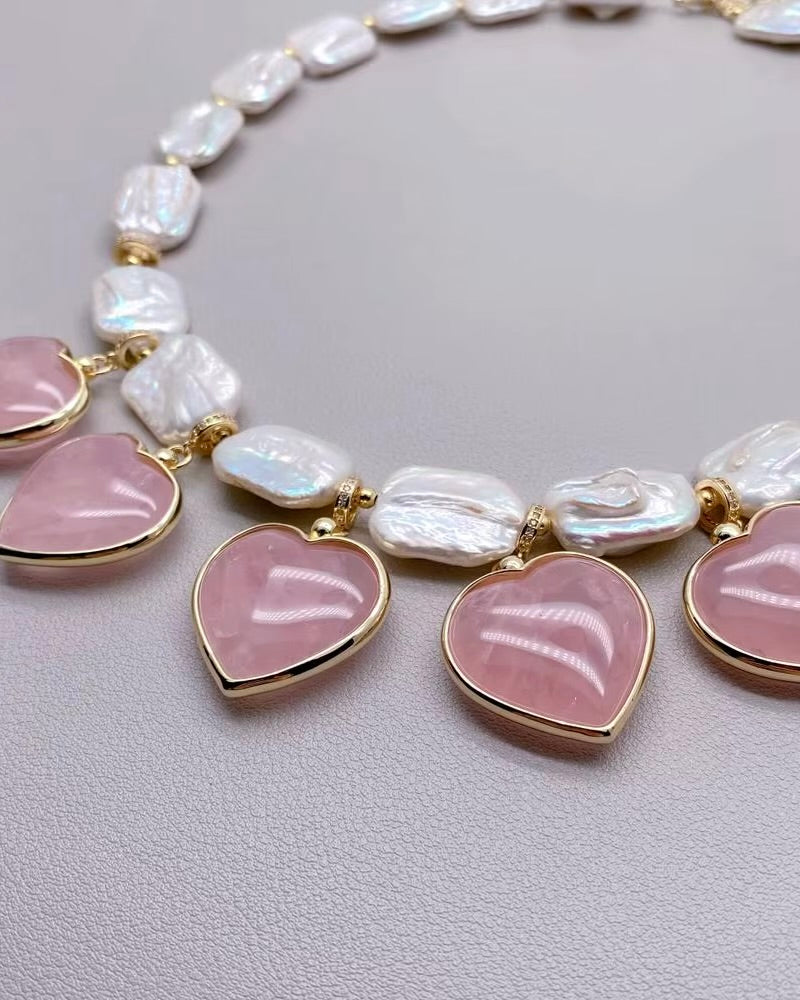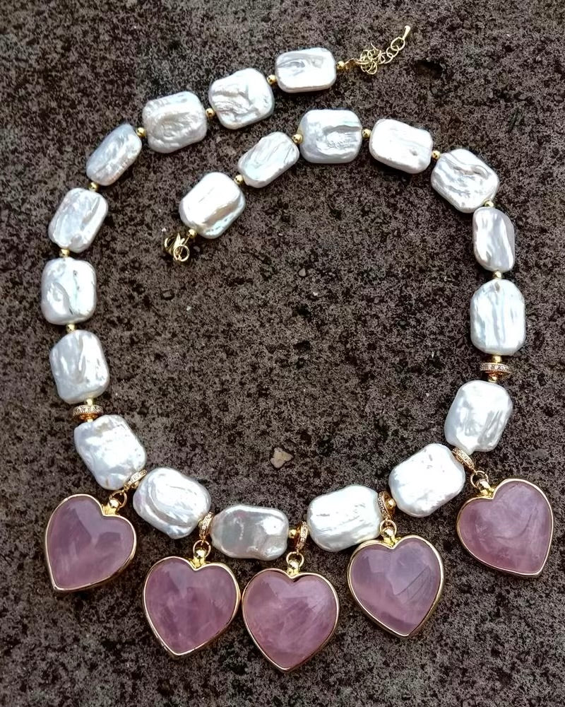 Ground yourself in nurturing energy with the Eternal Love Necklace, handcrafted from pearls and a delicate row of heart-shaped Rose Quartz. Revered for its gentle vibrations of unconditional love, this stone encourages emotional warmth and balance. A heartfelt statement piece that connects you to Mother Earth.