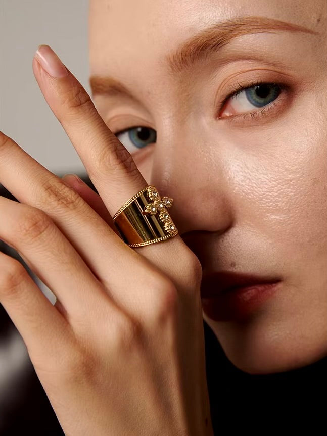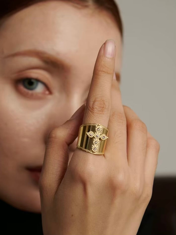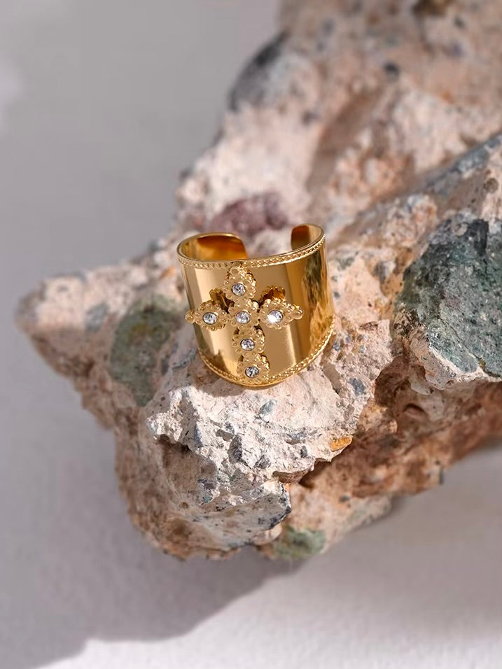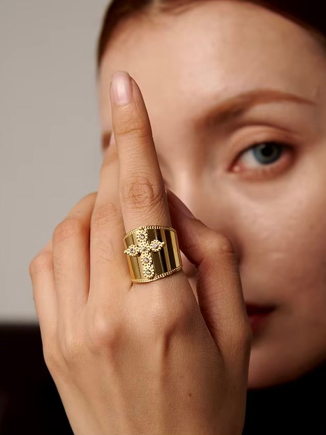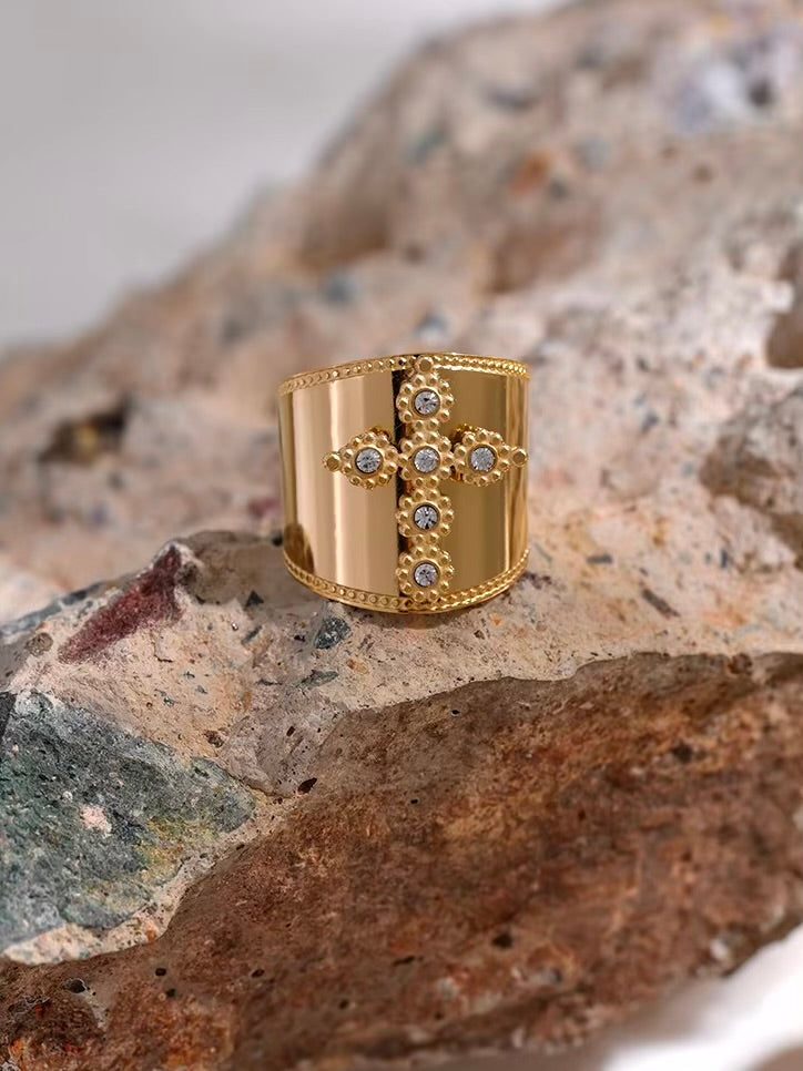 This ring features a bold, sleek design with a refined cross motif adorned with inlaid cristaux for a striking balance of elegance and edge. Its adjustable band ensures a perfect fit, while the lustrous gold enhances its timeless appeal.
