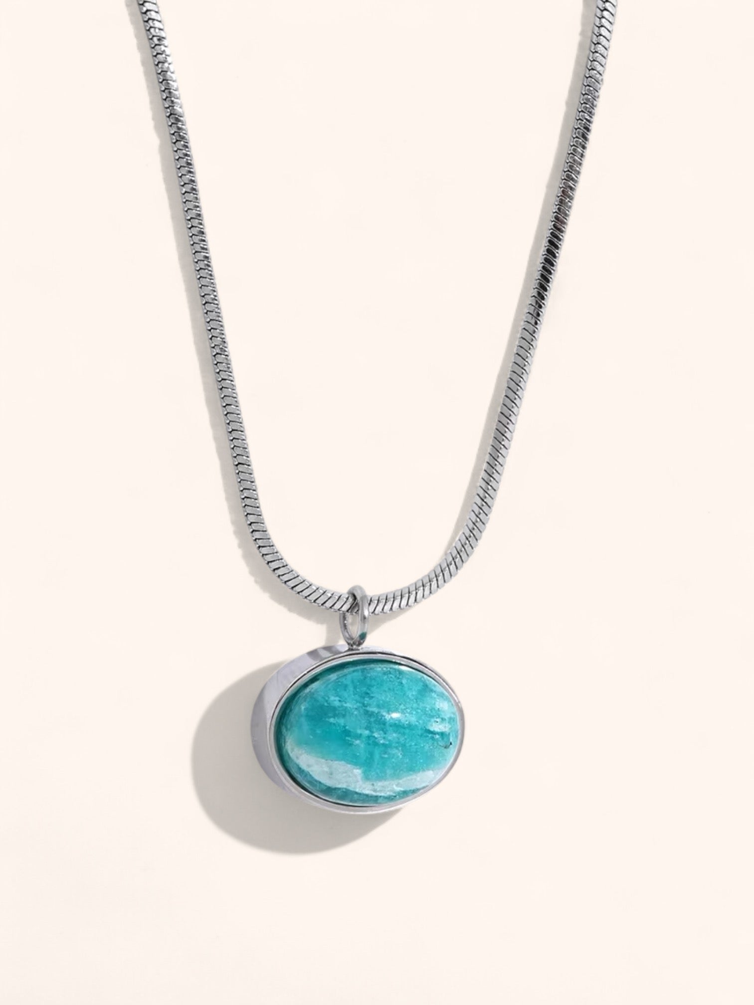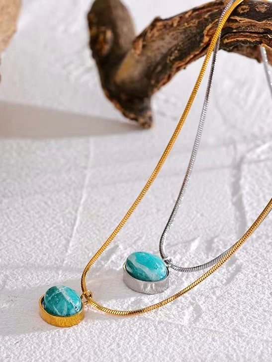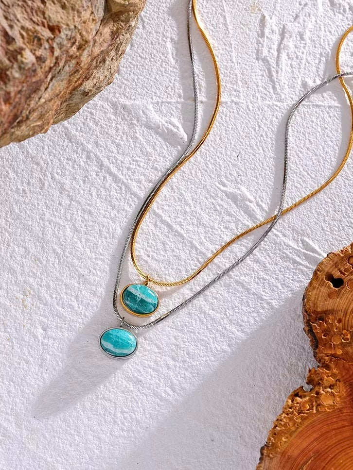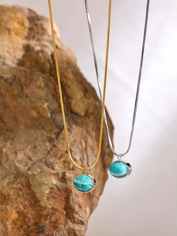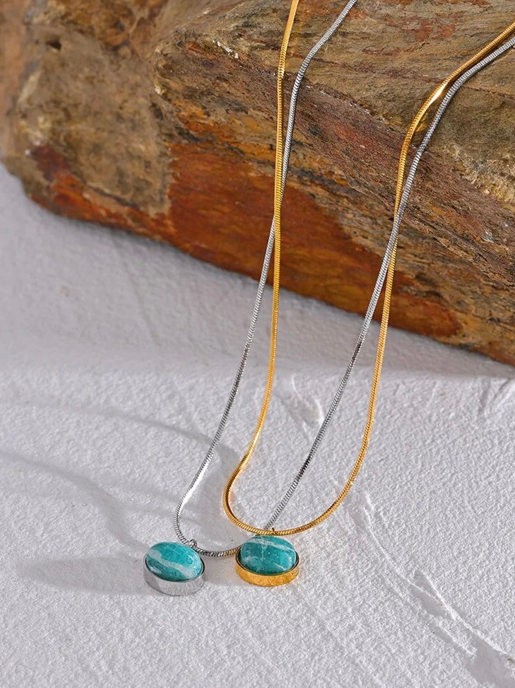 The Marée d'Argent Necklace features a sleek rope chain in gold or silver, adorned with a striking Amazonite stone pendant at its heart. Known for its calming energy, Amazonite is said to bring équilibre and tranquility to the wearer, making this necklace both a beautiful and functional piece.