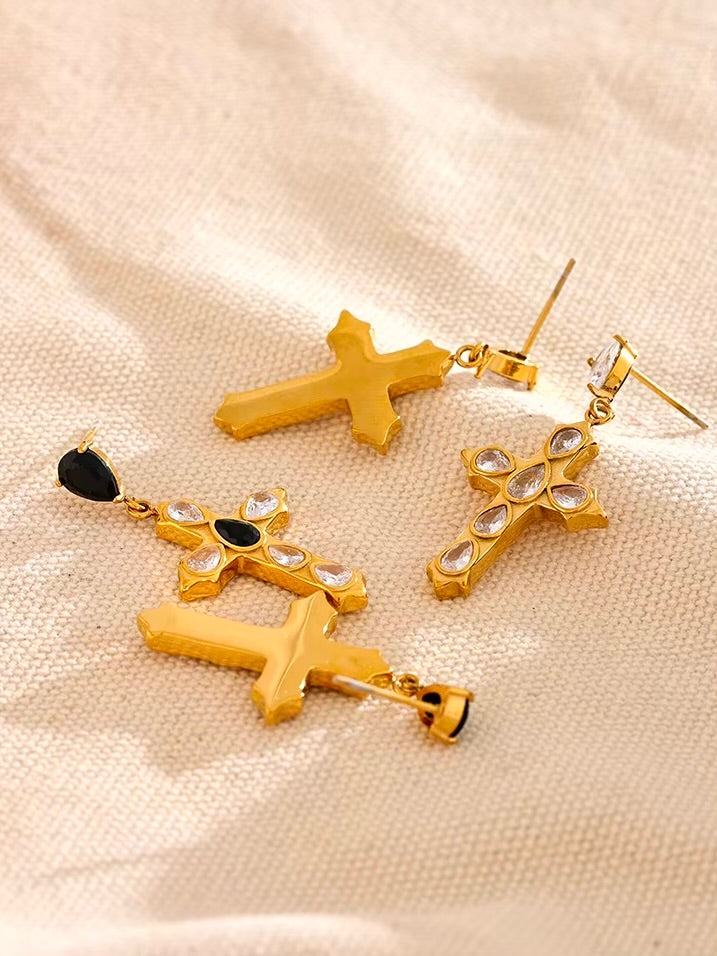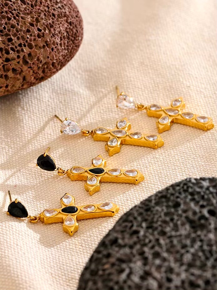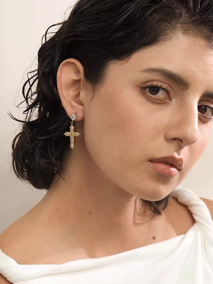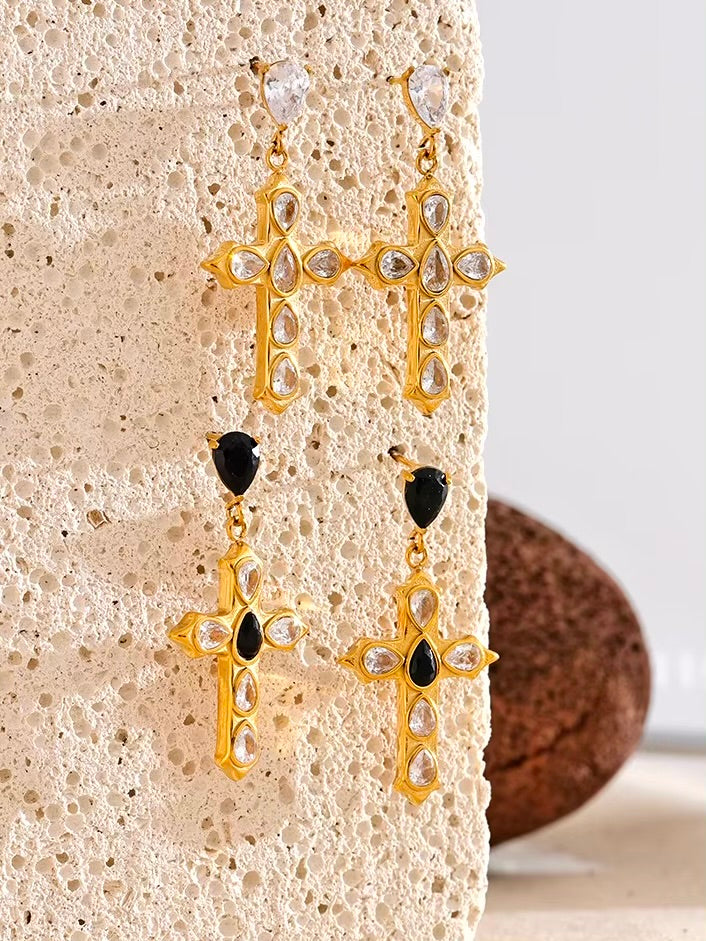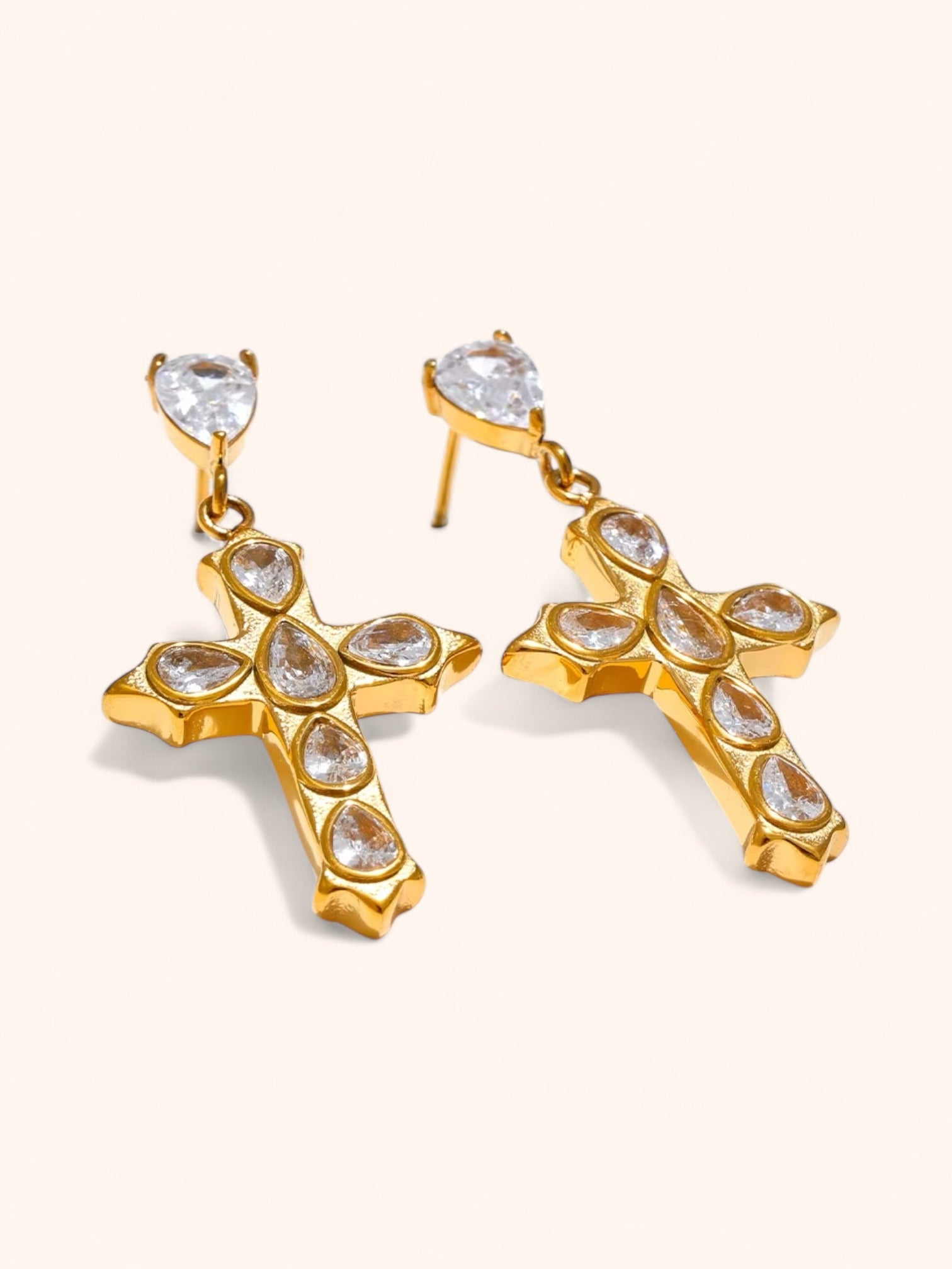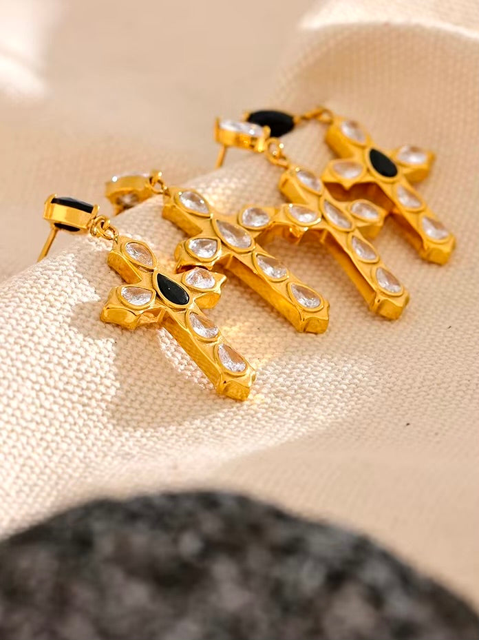 These earrings are embellished with shimmering crystal gemstones, exuding an ethereal charm. Available in gold, these statement drop earrings add a celestial touch to any ensemble.