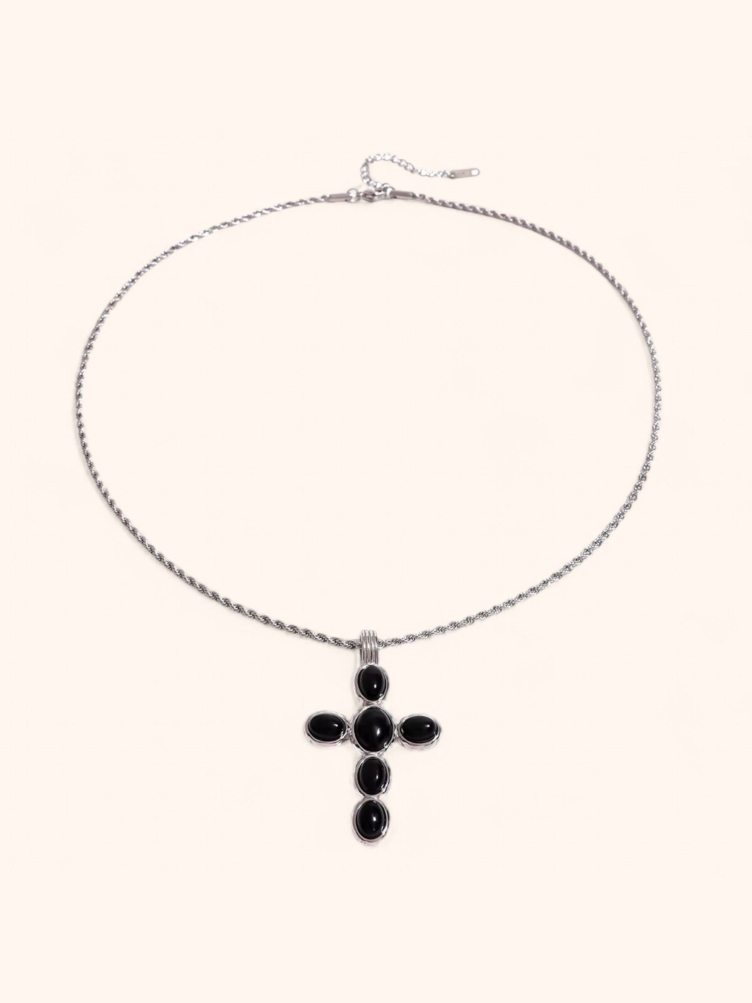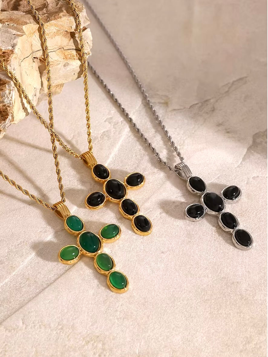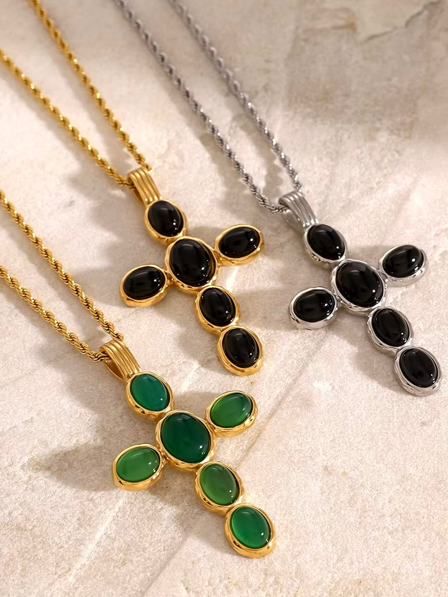 This necklace radiates timeless elegance with its gold or silver chain and a cross pendant adorned with a natural stone. This piece embodies grace and spiritual allure, with a touch of éclat from its delicate design, perfect for elevating any look.
