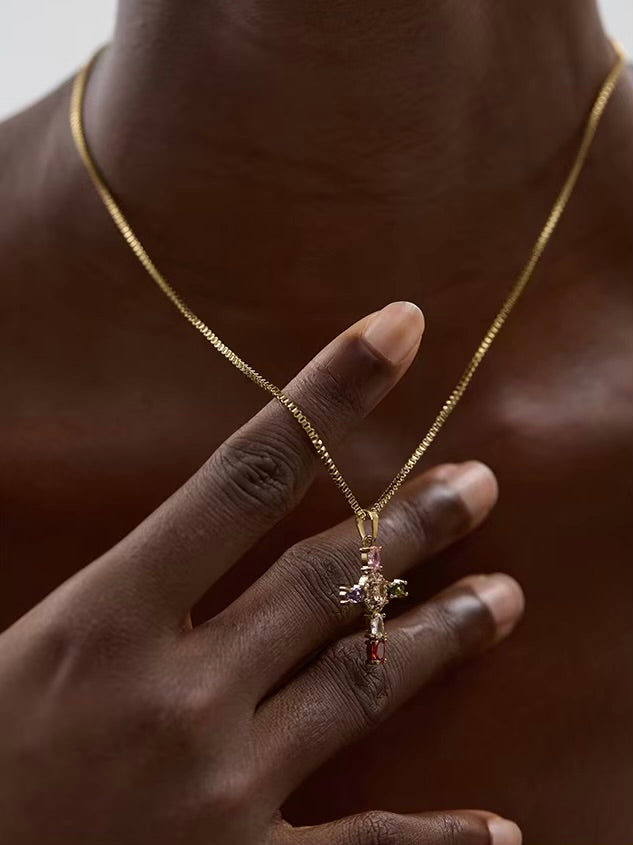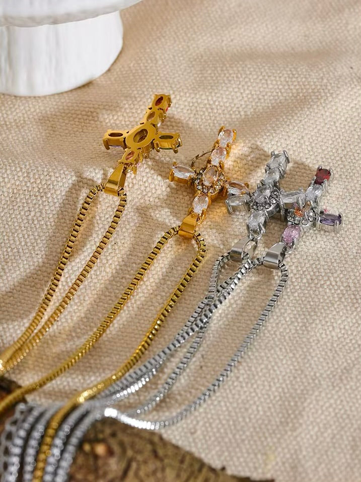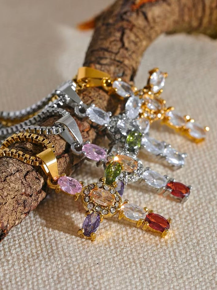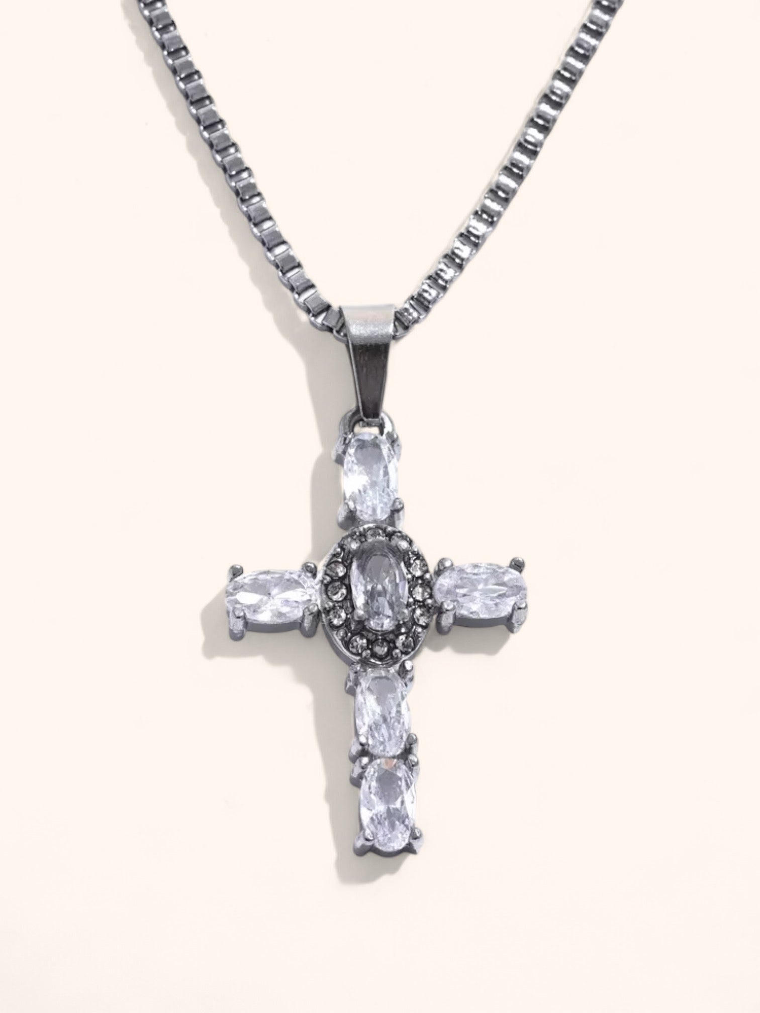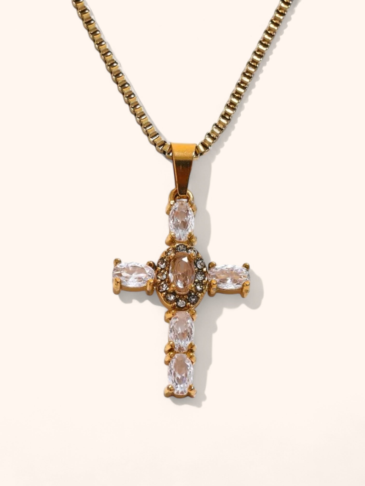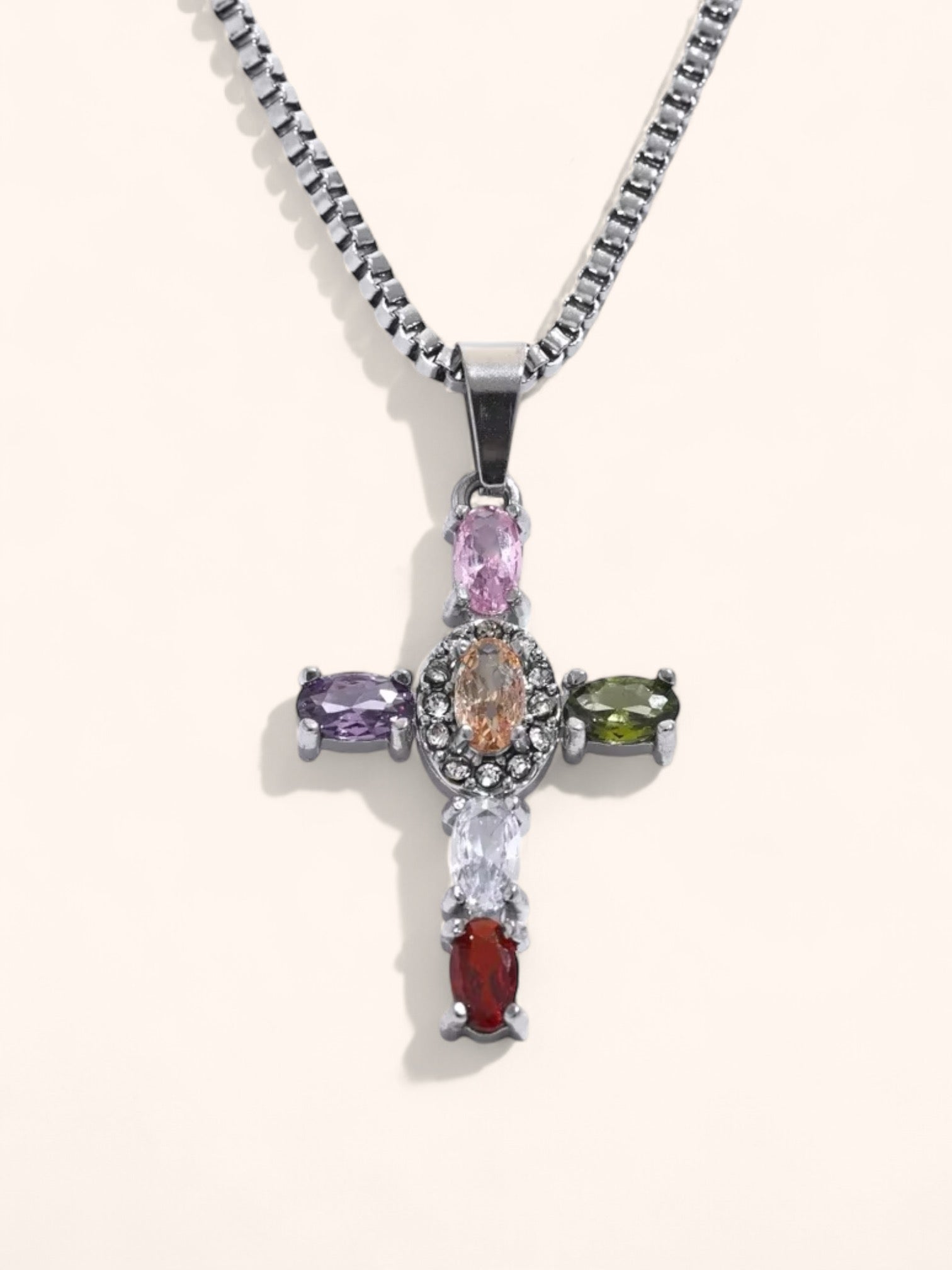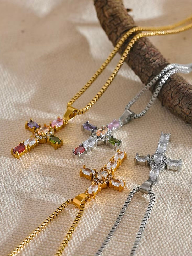 This necklace exudes timeless elegance with its delicate chain, available in gold or silver, featuring a cross pendant adorned with an array of dazzling crystal gemstones. This radiant piece adds a touch of divine beauté to any ensemble, making it a meaningful and stylish addition to your jewelry collection.