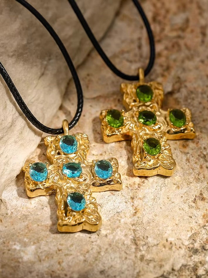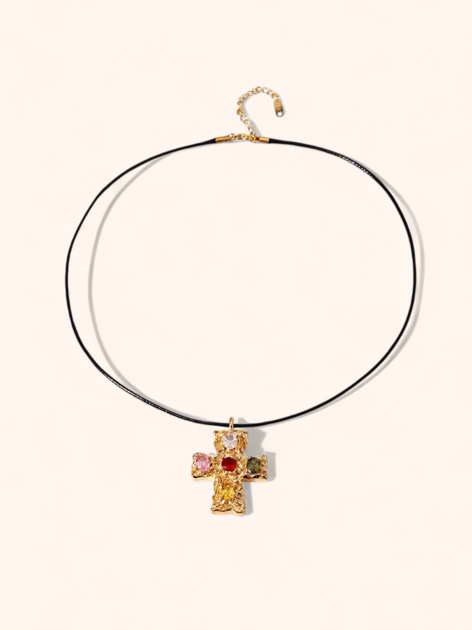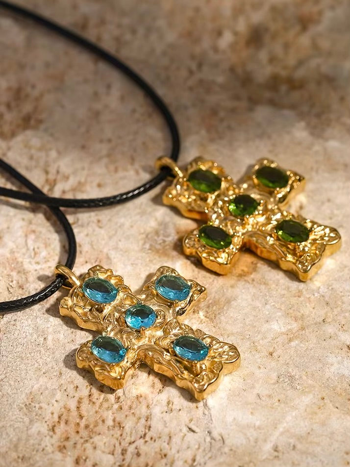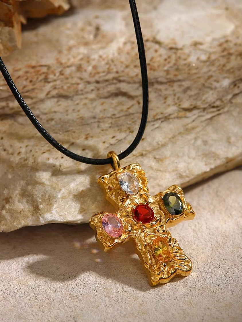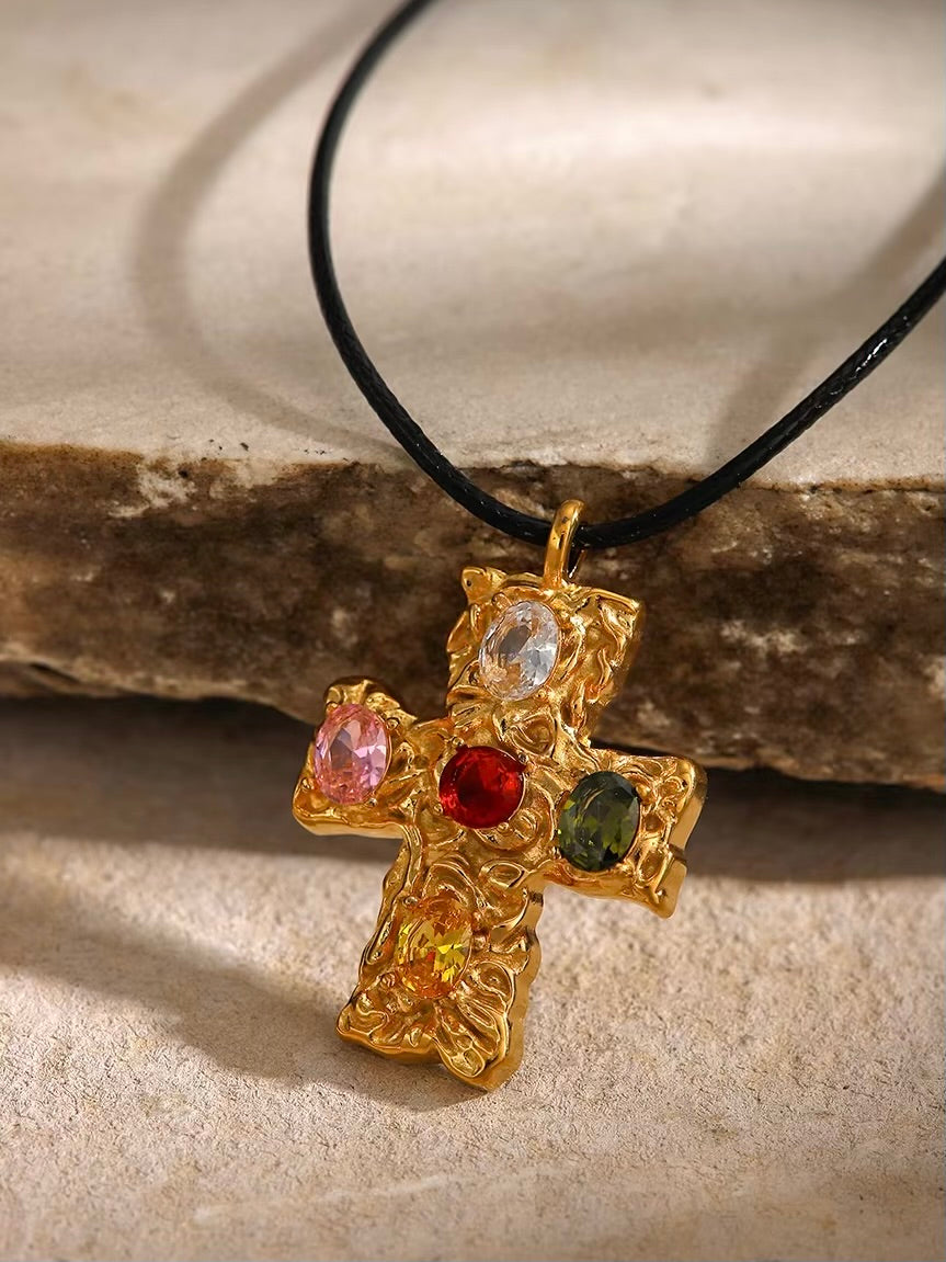 Featuring a bold black rope paired with a textured cross pendant adorned with vibrant gemstones. This striking design, with its radiant éclat, offers a refined balance of classic and contemporary, perfect for elevating any look.