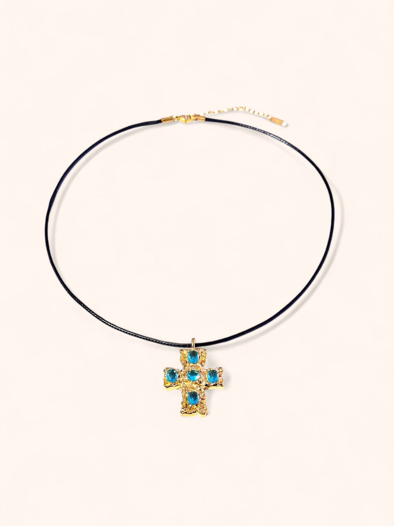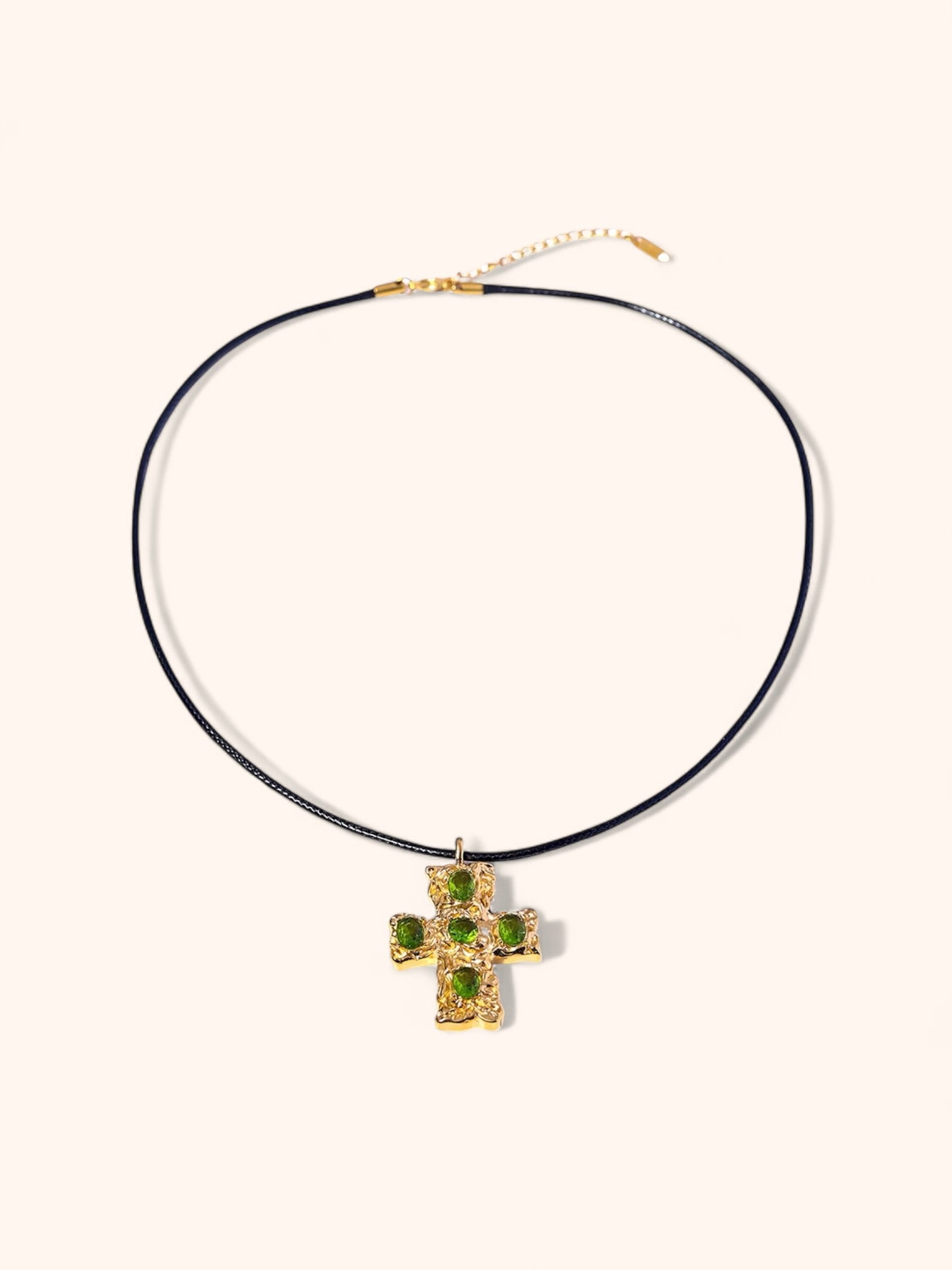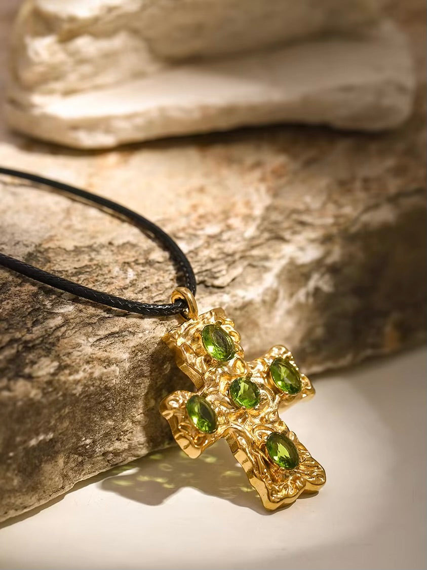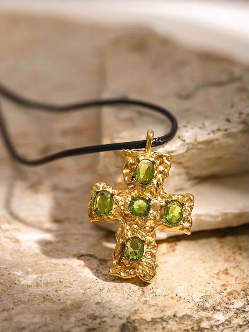 Featuring a bold black rope paired with a textured cross pendant adorned with vibrant gemstones. This striking design, with its radiant éclat, offers a refined balance of classic and contemporary, perfect for elevating any look.
